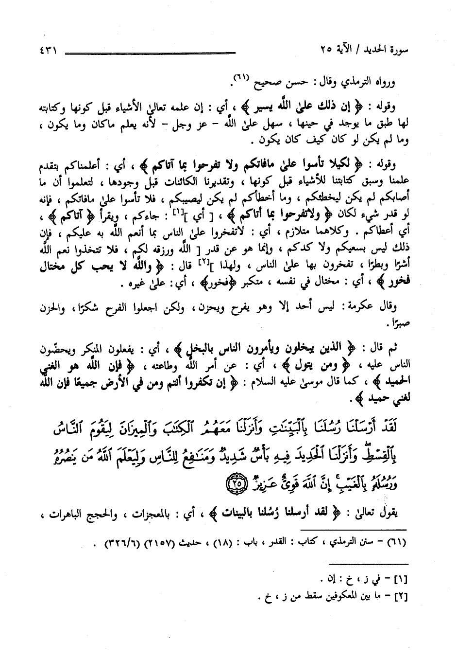 وَقَوْله تَعَالَى " لِكَيْلَا تَأْسَوْا عَلَى مَا فَاتَكُمْ وَلَا تَفْرَحُوا بِمَا آتَاكُمْ " أَيْ أَعْلَمْنَاكُمْ بِتَقَدُّمِ عِلْمنَا وَسَبْق كِتَابَتنَا لِلْأَشْيَاءِ قَبْل كَوْنهَا وَتَقْدِيرنَا الْكَائِنَات قَبْل وُجُودهَا لِتَعْلَمُوا أَنَّ مَا أَصَابَكُمْ لَمْ يَكُنْ لِيُخْطِئكُمْ وَمَا أَخْطَأَكُمْ لَمْ يَكُنْ لِيُصِيبَكُمْ فَلَا تَأْسَوْا عَلَى مَا فَاتَكُمْ لِأَنَّهُ لَوْ قُدِّرَ شَيْء لَكَانَ " وَلَا تَفْرَحُوا بِمَا آتَاكُمْ " أَيْ جَاءَكُمْ وَتَفْسِير " آتَاكُمْ " أَيْ أَعْطَاكُمْ وَكِلَاهُمَا مُتَلَازِم أَيْ لَا تَفْخَرُوا عَلَى النَّاس بِمَا أَنْعَمَ اللَّه بِهِ عَلَيْكُمْ فَإِنَّ ذَلِكَ لَيْسَ بِسَعْيِكُمْ وَلَا كَدّكُمْ وَإِنَّمَا هُوَ عَنْ قَدَر اللَّه وَرِزْقه لَكُمْ فَلَا تَتَّخِذُوا نِعَم اللَّه أَشَرًا وَبَطَرًا تَفْخَرُونَ بِهَا عَلَى النَّاس وَلِهَذَا قَالَ تَعَالَى" وَاَللَّه لَا يُحِبّ كُلّ مُخْتَال فَخُور " أَيْ مُخْتَال فِي نَفْسه مُتَكَبِّر " فَخُور " أَيْ عَلَى غَيْره وَقَالَ عِكْرِمَة لَيْسَ أَحَد إِلَّا وَهُوَ يَفْرَح وَيَحْزَن وَلَكِنْ اِجْعَلُوا الْفَرَح شُكْرًا وَالْحُزْن صَبْرًا .