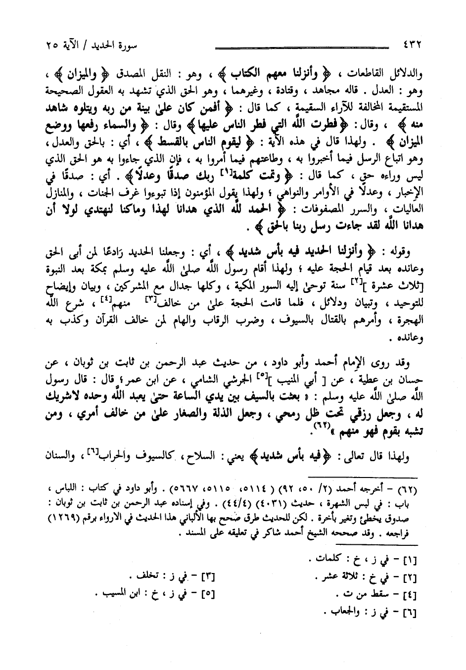 وَقَدْ رَوَى الْإِمَام أَحْمَد وَأَبُو دَاوُد مِنْ حَدِيث عَبْد الرَّحْمَن بْن ثَابِت بْن ثَوْبَان عَنْ حَسَّان بْن عَطِيَّة عَنْ أَبِي الْمُنِيب الْجُرَشِيّ الشَّامِيّ عَنْ اِبْن عُمَر قَالَ : قَالَ رَسُول اللَّه صَلَّى اللَّه عَلَيْهِ وَسَلَّمَ " بُعِثْت بِالسَّيْفِ بَيْن يَدَيْ السَّاعَة حَتَّى يُعْبَد اللَّه وَحْده لَا شَرِيك لَهُ وَجُعِلَ رِزْقِي تَحْت ظِلّ رُمْحِي وَجُعِلَ الذِّلَّة وَالصَّغَار عَلَى مَنْ خَالَفَ أَمْرِي وَمَنْ تَشَبَّهَ بِقَوْمٍ فَهُوَ مِنْهُمْ" وَلِهَذَا قَالَ تَعَالَى " فِيهِ بَأْس شَدِيد " يَعْنِي السِّلَاح كَالسُّيُوفِ وَالْحِرَاب وَالسِّنَان