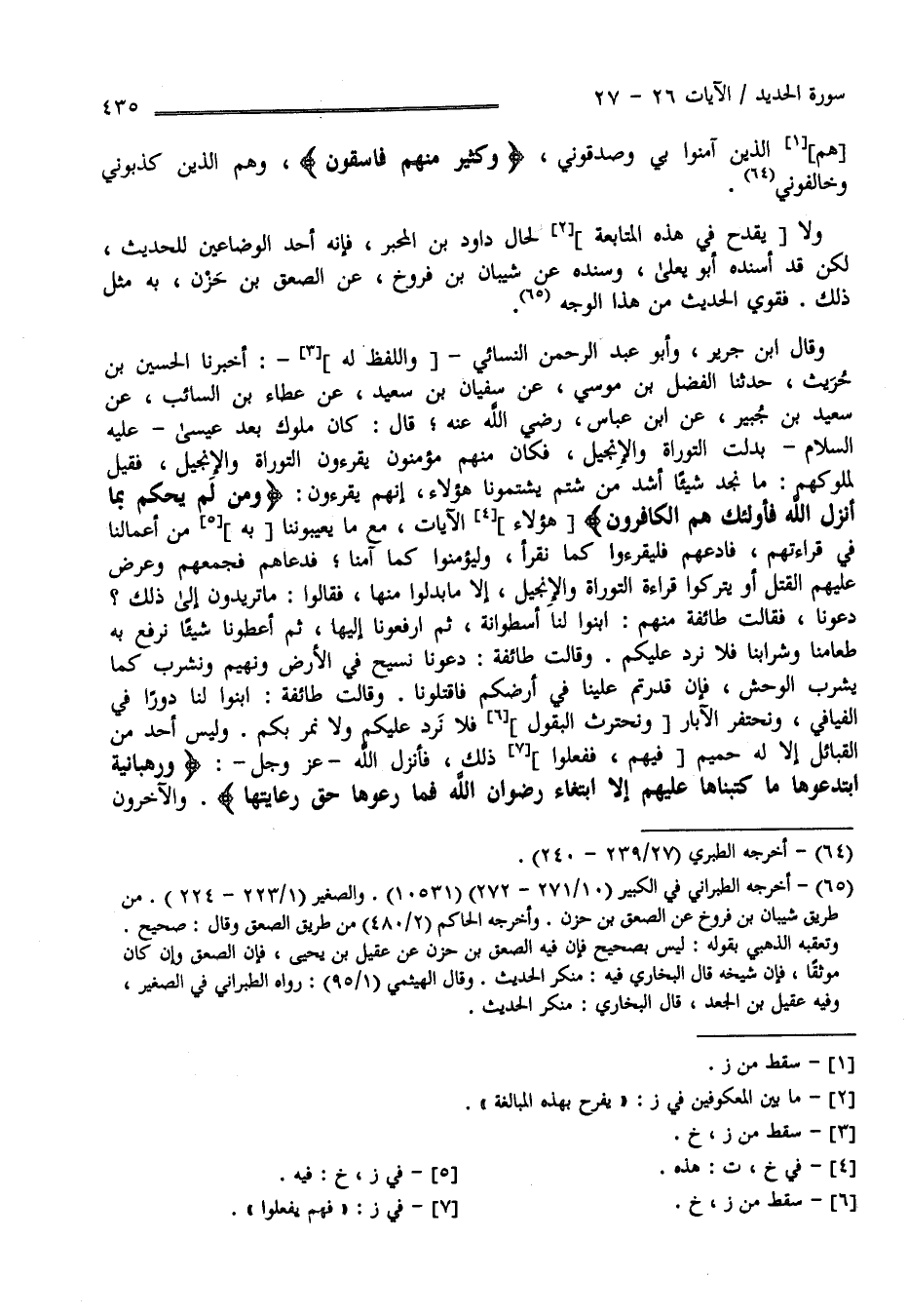 مِنْهُمْ فَاسِقُونَ " وَهُمْ الَّذِينَ كَذَّبُونِي وَخَالَفُونِي وَلَا يُقْدَح فِي هَذِهِ الْمُتَابَعَة لِحَالِ دَاوُد بْن الْمُحَبَّر فَإِنَّهُ أَحَد الْوَضَّاعِينَ لِلْحَدِيثِ وَلَكِنْ قَدْ أَسْنَدَهُ أَبُو يَعْلَى عَنْ شَيْبَان بْن فَرُّوخ عَنْ الصَّعْق بْن حَزْن بِهِ مِثْل ذَلِكَ فَقَوِيَ الْحَدِيث مِنْ هَذَا الْوَجْه وَقَالَ اِبْن جَرِير وَأَبُو عَبْد الرَّحْمَن النَّسَائِيّ وَاللَّفْظ لَهُ أَخْبَرَنَا الْحُسَيْن بْن حُرَيْث حَدَّثَنَا الْفَضْل بْن مُوسَى عَنْ سُفْيَان بْن سَعِيد عَنْ عَطَاء اِبْن السَّائِب عَنْ سَعِيد بْن جُبَيْر عَنْ اِبْن عَبَّاس رَضِيَ اللَّه عَنْهُمَا قَالَ كَانَ مُلُوك بَعْد عِيسَى عَلَيْهِ السَّلَام بَدَّلَتْ التَّوْرَاة وَالْإِنْجِيل فَكَانَ مِنْهُمْ مُؤْمِنُونَ يَقْرَءُونَ التَّوْرَاة وَالْإِنْجِيل فَقِيلَ لِمُلُوكِهِمْ مَا نَجِد شَيْئًا أَشَدّ مِنْ شَتْم يَشْتُمُونَاهُ هَؤُلَاءِ إِنَّهُمْ يَقْرَءُونَ " وَمَنْ لَمْ يَحْكُم بِمَا أَنْزَلَ اللَّه فَأُولَئِكَ هُمْ الْكَافِرُونَ" هَذِهِ الْآيَات مَعَ مَا يَعِيبُونَنَا بِهِ مِنْ أَعْمَالنَا فِي قِرَاءَتهمْ فَادْعُهُمْ فَلْيَقْرَءُوا كَمَا نَقْرَأ وَلْيُؤْمِنُوا كَمَا آمَنَّا فَدَعَاهُمْ فَجَمَعَهُمْ وَعَرَضَ عَلَيْهِمْ الْقَتْل أَوْ يَتْرُكُوا قِرَاءَة التَّوْرَاة وَالْإِنْجِيل إِلَّا مَا بَدَّلُوا مِنْهَا فَقَالُوا مَا تُرِيدُونَ إِلَى ذَلِكَ دَعُونَا فَقَالَتْ طَائِفَة مِنْهُمْ اِبْنُوا لَنَا أُسْطُوَانَة ثُمَّ اِرْفَعُونَا إِلَيْهَا ثُمَّ أَعْطُونَا شَيْئًا نَرْفَع بِهِ طَعَامنَا وَشَرَابنَا فَلَا نَرُدّ عَلَيْكُمْ وَقَالَتْ طَائِفَة دَعُونَا نَسِيح فِي الْأَرْض وَنَهِيم وَنَشْرَب كَمَا يَشْرَب الْوَحْش فَإِنْ قَدَرْتُمْ عَلَيْنَا فِي أَرْضكُمْ فَاقْتُلُونَا وَقَالَتْ طَائِفَة اِبْنُوا لَنَا دُورًا فِي الْفَيَافِي وَنَحْتَفِر الْآبَار وَنَحْرُث الْبُقُول فَلَا نَرُدّ عَلَيْكُمْ وَلَا نَمُرّ بِكُمْ وَلَيْسَ أَحَد مِنْ الْقَبَائِل إِلَّا لَهُ حَمِيم فِيهِمْ فَفَعَلُوا ذَلِكَ فَأَنْزَلَ اللَّه تَعَالَى " وَرَهْبَانِيَّة اِبْتَدَعُوهَا مَا كَتَبْنَاهَا عَلَيْهِمْ إِلَّا اِبْتِغَاء رِضْوَان اللَّه فَمَا رَعَوْهَا حَقّ رِعَايَتهَا " وَالْآخَرُونَ