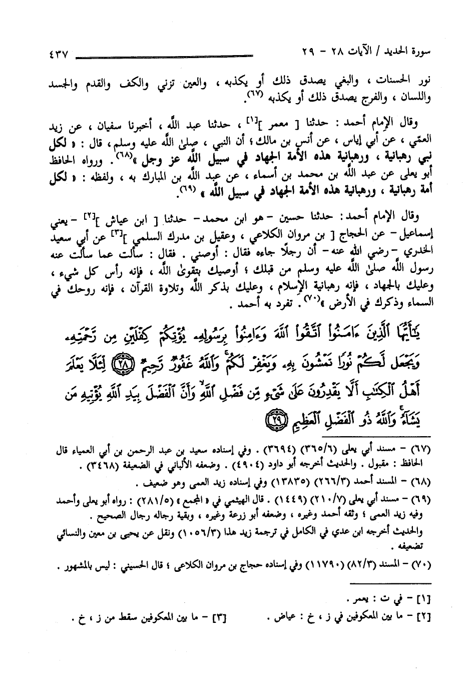 نُور الْحَسَنَات وَالْبَغْي يُصَدِّق ذَلِكَ أَوْ يُكَذِّبهُ وَالْعَيْن تَزْنِي وَالْكَفّ وَالْقَدَم وَالْجَسَد وَاللِّسَان وَالْفَرْج يُصَدِّق ذَلِكَ أَوْ يُكَذِّبهُ وَقَالَ الْإِمَام أَحْمَد حَدَّثَنَا مَعْمَر حَدَّثَنَا عَبْد اللَّه أَخْبَرَنَا سُفْيَان عَنْ زَيْد الْعِمِّيّ عَنْ أَبِي إِيَاس عَنْ أَنَس بْن مَالِك أَنَّ النَّبِيّ صَلَّى اللَّه عَلَيْهِ وَسَلَّمَ قَالَ " لِكُلِّ نَبِيّ رَهْبَانِيَّة وَرَهْبَانِيَّة هَذِهِ الْأُمَّة الْجِهَاد فِي سَبِيل اللَّه عَزَّ وَجَلَّ " وَرَوَاهُ الْحَافِظ أَبُو يَعْلَى عَنْ عَبْد اللَّه بْن مُحَمَّد بْن أَسْمَاء عَنْ عَبْد اللَّه بْن الْمُبَارَك بِهِ وَلَفْظه " لِكُلِّ أُمَّة رَهْبَانِيَّة وَرَهْبَانِيَّة هَذِهِ الْأُمَّة الْجِهَاد فِي سَبِيل اللَّه " .