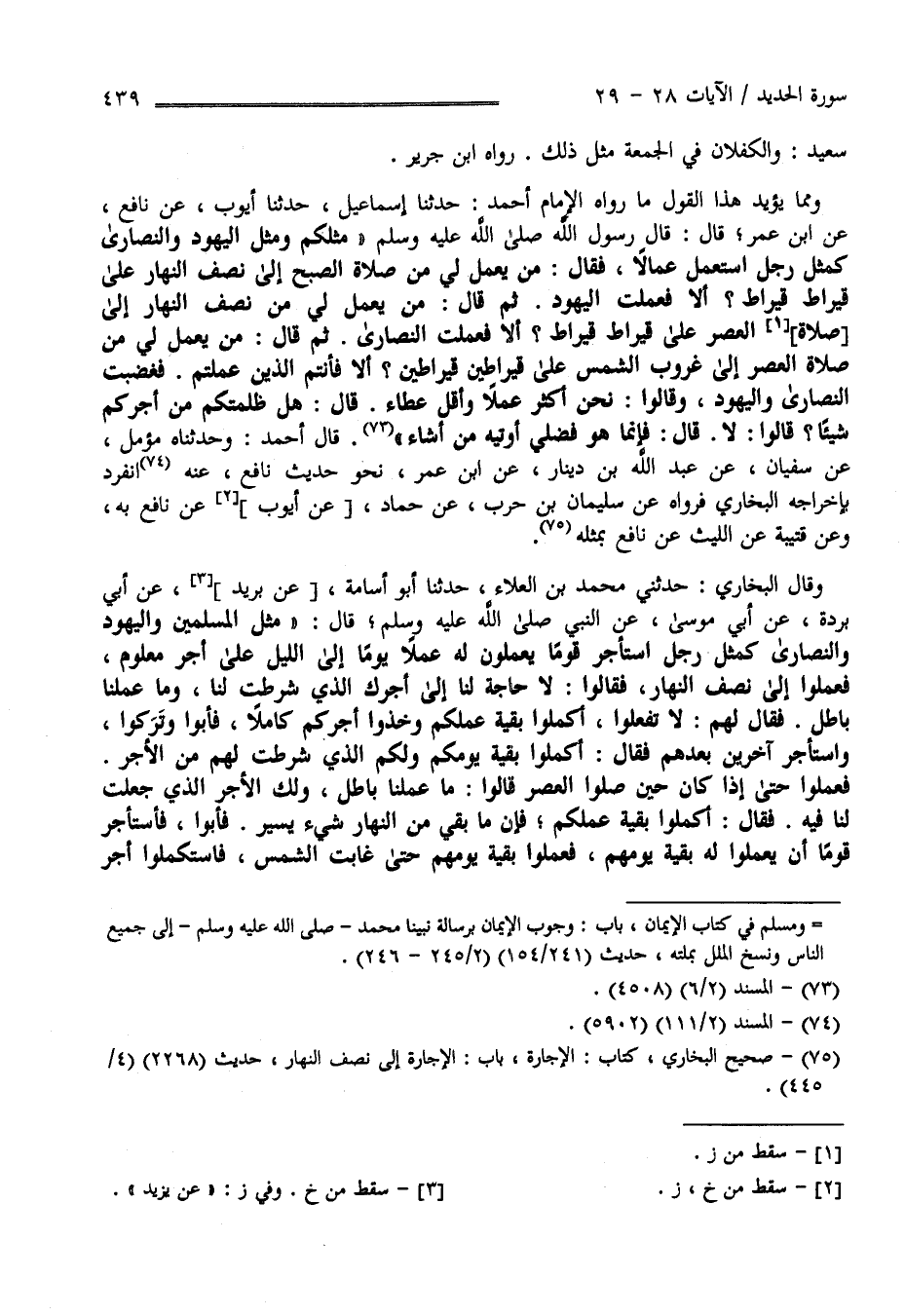 سَعِيد : وَالْكِفْلَانِ فِي الْجُمُعَة مِثْل ذَلِكَ رَوَاهُ اِبْن جَرِير وَمِمَّا يُؤَيِّد هَذَا الْقَوْل مَا رَوَاهُ الْإِمَام أَحْمَد حَدَّثَنَا إِسْمَاعِيل حَدَّثَنَا أَيُّوب عَنْ نَافِع عَنْ اِبْن عُمَر قَالَ : قَالَ رَسُول اللَّه صَلَّى اللَّه عَلَيْهِ وَسَلَّمَ" مَثَلكُمْ وَمَثَل الْيَهُود وَالنَّصَارَى كَمَثَلِ رَجُل اِسْتَعْمَلَ عُمَّالًا فَقَالَ مَنْ يَعْمَل لِي مِنْ صَلَاة الصُّبْح إِلَى نِصْف النَّهَار عَلَى قِيرَاط قِيرَاط ؟ أَلَا فَعَمِلَتْ الْيَهُود ثُمَّ قَالَ مَنْ يَعْمَل لِي مِنْ صَلَاة الظُّهْر إِلَى صَلَاة الْعَصْر عَلَى قِيرَاط ؟ قِيرَاط ؟ أَلَا فَعَمِلَتْ النَّصَارَى ثُمَّ قَالَ مَنْ يَعْمَل لِي مِنْ صَلَاة الْعَصْر إِلَى غُرُوب الشَّمْس عَلَى قِيرَاطَيْنِ قِيرَاطَيْنِ ؟ أَلَا فَأَنْتُمْ الَّذِينَ عَمِلْتُمْ فَغَضِبَتْ النَّصَارَى وَالْيَهُود وَقَالُوا نَحْنُ أَكْثَر عَمَلًا وَأَقَلّ عَطَاء قَالَ هَلْ ظَلَمْتُكُمْ مِنْ أَجْركُمْ شَيْئًا ؟ قَالُوا لَا قَالَ فَإِنَّمَا هُوَ فَضْلِي أُوتِيه مَنْ أَشَاء " قَالَ أَحْمَد وَحَدَّثَنَاهُ مُؤَمِّل عَنْ سُفْيَان عَنْ عَبْد اللَّه بْن دِينَار عَنْ اِبْن عُمَر نَحْو حَدِيث نَافِع عَنْهُ اِنْفَرَدَ بِإِخْرَاجِهِ الْبُخَارِيّ فَرَوَاهُ عَنْ سُلَيْمَان بْن حَرْب عَنْ حَمَّاد عَنْ