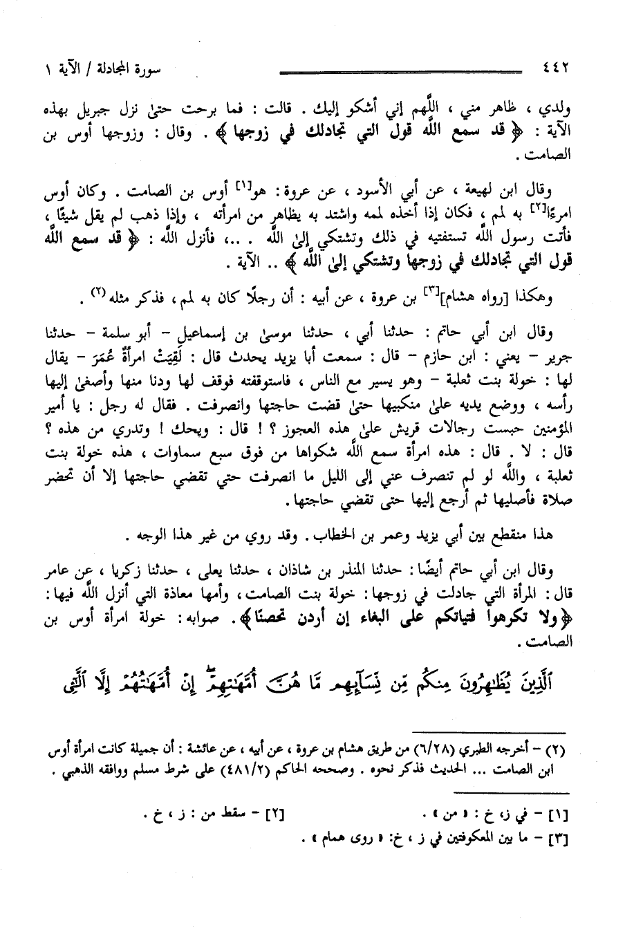 هَذَا مُنْقَطِع بَيْن أَبِي يَزِيد وَعُمَر بْن الْخَطَّاب وَقَدْ رُوِيَ مِنْ غَيْر هَذَا الْوَجْه وَقَالَ اِبْن أَبِي حَاتِم أَيْضًا حَدَّثَنَا الْمُنْذِر بْن شَاذَان حَدَّثَنَا يَعْلَى حَدَّثَنَا زَكَرِيَّا عَنْ عَامِر قَالَ : الْمَرْأَة الَّتِي جَادَلَتْ فِي زَوْجهَا خَوْلَة بِنْت الصَّامِت وَأُمّهَا مُعَاذَة الَّتِي أَنْزَلَ اللَّه فِيهَا " وَلَا تُكْرِهُوا فَتَيَاتكُمْ عَلَى الْبِغَاء إِنْ أَرَدْنَ تَحَصُّنًا " صَوَابه خَوْلَة اِمْرَأَة أَوْس بْن الصَّامِت.