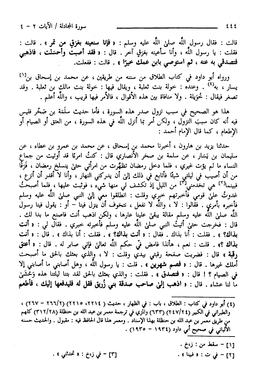 هَذَا هُوَ الصَّحِيح فِي سَبَب نُزُول هَذِهِ السُّورَة فَأَمَّا حَدِيث سَلَمَة بْن صَخْر فَلَيْسَ فِيهِ أَنَّهُ كَانَ سَبَب النُّزُول وَلَكِنْ أَمَرَ بِمَا أَنْزَلَ اللَّه فِي هَذِهِ السُّورَة مِنْ الْعِتْق أَوْ الصِّيَام أَوْ الْإِطْعَام كَمَا قَالَ الْإِمَام أَحْمَد حَدَّثَنَا يَزِيد بْن هَارُون أَخْبَرَنَا مُحَمَّد بْن إِسْحَاق بْن يَسَار عَنْ مُحَمَّد بْن عَمْرو بْن عَطَاء عَنْ سُلَيْمَان بْن يَسَار عَنْ سَلَمَة بْن صَخْر الْأَنْصَارِيّ قَالَ كُنْت اِمْرَأً قَدْ أُوتِيت مِنْ جِمَاع النِّسَاء مَا لَمْ يُؤْتَ غَيْرِي فَلَمَّا دَخَلَ رَمَضَان تَظَهَّرْت مِنْ اِمْرَأَتِي حَتَّى يَنْسَلِخ رَمَضَان فَرَقًا مِنْ أَنْ أُصِيب فِي لَيْلَتِي شَيْئًا فَأَتَتَابَع فِي ذَلِكَ إِلَى أَنْ يُدْرِكنِي النَّهَار وَأَنَا لَا أَقْدِر أَنْ أَنْزِع فَبَيْنَمَا هِيَ تَخْدُمنِي مِنْ اللَّيْل إِذْ تَكَشَّفَ لِي مِنْهَا شَيْء فَوَثَبْت عَلَيْهَا فَلَمَّا أَصْبَحْت غَدَوْت عَلَى قَوْمِي فَأَخْبَرْتهمْ خَبَرِي وَقُلْت اِنْطَلِقُوا مَعِي إِلَى النَّبِيّ صَلَّى اللَّه عَلَيْهِ وَسَلَّمَ فَأُخْبِرهُ بِأَمْرِي فَقَالُوا لَا وَاَللَّه لَا نَفْعَل نَتَخَوَّف أَنْ يَنْزِل فِينَا أَوْ يَقُول فِينَا رَسُول اللَّه صَلَّى اللَّه عَلَيْهِ وَسَلَّمَ مَقَالَة يَبْقَى عَلَيْنَا عَارهَا وَلَكِنْ اِذْهَبْ أَنْتَ فَاصْنَعْ مَا بَدَا لَك قَالَ فَخَرَجْت حَتَّى أَتَيْت النَّبِيّ صَلَّى اللَّه عَلَيْهِ وَسَلَّمَ فَأَخْبَرْته خَبَرِي فَقَالَ لِي " أَنْتَ بِذَاكَ " فَقُلْت أَنَا بِذَاكَ فَقَالَ " أَنْتَ بِذَاكَ" فَقُلْت أَنَا بِذَاكَ قَالَ " أَنْتَ بِذَاكَ " قُلْت نَعَمْ هَا أَنَا ذَا فَأَمْضِ فِيَّ حُكْم اللَّه عَزَّ وَجَلَّ فَإِنِّي صَابِر لَهُ قَالَ " اِعْتِقْ رَقَبَة " قَالَ فَضَرَبْت صَفْحَة رَقَبَتِي بِيَدِي وَقُلْت لَا وَاَلَّذِي بَعَثَك بِالْحَقِّ مَا أَصْبَحْت أَمْلِك غَيْرهَا قَالَ " فَصُمْ شَهْرَيْنِ مُتَتَابِعَيْنِ " قُلْت يَا رَسُول اللَّه وَهَلْ أَصَابَنِي مَا أَصَابَنِي إِلَّا فِي الصِّيَام قَالَ" فَتَصَدَّقَ " فَقُلْت وَاَلَّذِي بَعَثَك بِالْحَقِّ لَقَدْ بِتْنَا لَيْلَتنَا هَذِهِ وَحْشًا مَا لَنَا عَشَاء قَالَ " اِذْهَبْ إِلَى صَاحِب صَدَقَة بَنِي زُرَيْق فَقُلْ لَهُ فَلْيَدْفَعْهَا إِلَيْك فَأَطْعِمْ