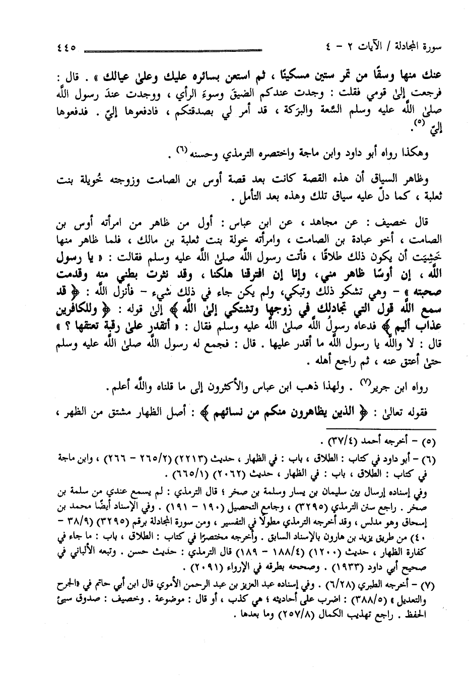 وَهَكَذَا رَوَاهُ أَبُو دَاوُد وَابْن مَاجَهْ وَاخْتَصَرَهُ التِّرْمِذِيّ وَحَسَّنَهُ وَظَاهِر السِّيَاق أَنَّ هَذِهِ الْقِصَّة كَانَتْ بَعْد قِصَّة أَوْس بْن الصَّامِت وَزَوْجَته خُوَيْلَة بِنْت ثَعْلَبَة كَمَا دَلَّ عَلَيْهِ سِيَاق تِلْكَ وَهَذِهِ بَعْد التَّأَمُّل قَالَ خُصَيْف عَنْ مُجَاهِد عَنْ اِبْن عَبَّاس أَوَّل مَنْ ظَاهَرَ مِنْ اِمْرَأَته أَوْس بْن الصَّامِت أَخُو عُبَادَة بْن الصَّامِت وَامْرَأَته خَوْلَة بِنْت ثَعْلَبَة بْن مَالِك فَلَمَّا ظَاهَرَ مِنْهَا خَشِيَتْ أَنْ يَكُون ذَلِكَ طَلَاقًا فَأَتَتْ رَسُول اللَّه صَلَّى اللَّه عَلَيْهِ وَسَلَّمَ فَقَالَتْ يَا رَسُول اللَّه إِنَّ أَوْسًا ظَاهَرَ مِنِّي وَإِنَّا إِنْ اِفْتَرَقْنَا هَلَكْنَا وَقَدْ نَثَرْت بَطْنِي مِنْهُ وَقَدَّمْت صُحْبَته وَهِيَ تَشْكُو ذَلِكَ وَتَبْكِي وَلَمْ يَكُنْ جَاءَ فِي ذَلِكَ شَيْء فَأَنْزَلَ اللَّه تَعَالَى " قَدْ سَمِعَ اللَّه قَوْل الَّتِي تُجَادِلك فِي زَوْجهَا وَتَشْتَكِي إِلَى اللَّه - إِلَى قَوْله تَعَالَى - وَلِلْكَافِرِينَ عَذَاب أَلِيم " فَدَعَاهُ رَسُول اللَّه صَلَّى اللَّه عَلَيْهِ وَسَلَّمَ فَقَالَ " أَتَقْدِرُ عَلَى رَقَبَة تُعْتِقهَا " قَالَ لَا وَاَللَّه يَا رَسُول اللَّه مَا أَقْدِر عَلَيْهَا قَالَ فَجَمَعَ لَهُ رَسُول اللَّه صَلَّى اللَّه عَلَيْهِ وَسَلَّمَ حَتَّى أَعْتَقَ عِتْقه ثُمَّ رَاجَعَ أَهْله .