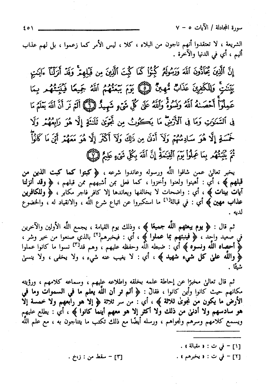 قَالَ تَعَالَى مُخْبِرًا عَنْ إِحَاطَة عِلْمه بِخَلْقِهِ وَاطِّلَاعه عَلَيْهِمْ وَسَمَاعه كَلَامهمْ وَرُؤْيَته مَكَانهمْ حَيْثُ كَانُوا وَأَيْنَ كَانُوا فَقَالَ تَعَالَى " أَلَمْ تَرَ أَنَّ اللَّه يَعْلَم مَا فِي السَّمَوَات وَمَا فِي الْأَرْض مَا يَكُون مِنْ نَجْوَى ثَلَاثه " أَيْ مِنْ سِرّ ثَلَاثه" إِلَّا هُوَ رَابِعهمْ وَلَا خَمْسَة إِلَّا هُوَ سَادِسهمْ وَلَا أَدْنَى مِنْ ذَلِكَ وَلَا أَكْثَر إِلَّا هُوَ مَعَهُمْ أَيْنَمَا كَانُوا" أَيْ مُطَّلِع عَلَيْهِمْ يَسْمَع كَلَامهمْ وَسِرّهمْ وَنَجْوَاهُمْ وَرُسُله أَيْضًا مَعَ ذَلِكَ تَكْتُب مَا يَتَنَاجَوْنَ بِهِ مَعَ عِلْم اللَّه