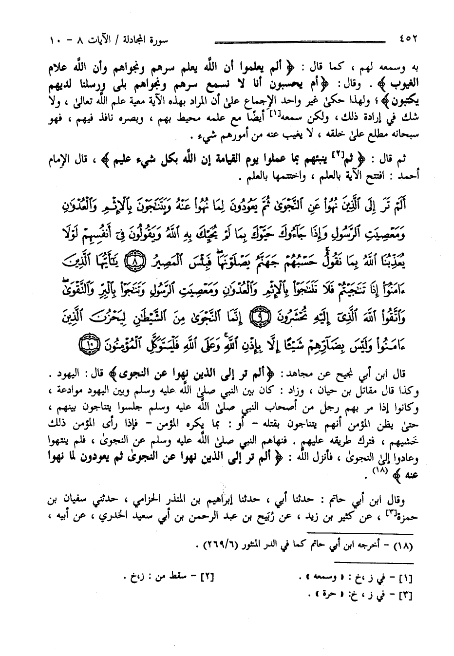 أَلَمْ تَرَ إِلَى الَّذِينَ نُهُوا عَنِ النَّجْوَى ثُمَّ يَعُودُونَ لِمَا نُهُوا عَنْهُ وَيَتَنَاجَوْنَ بِالْإِثْمِ وَالْعُدْوَانِ وَمَعْصِيَةِ الرَّسُولِ وَإِذَا جَاءُوكَ حَيَّوْكَ بِمَا لَمْ يُحَيِّكَ بِهِ اللَّهُ وَيَقُولُونَ فِي أَنْفُسِهِمْ لَوْلَا يُعَذِّبُنَا اللَّهُ بِمَا نَقُولُ حَسْبُهُمْ جَهَنَّمُ يَصْلَوْنَهَا فَبِئْسَ الْمَصِيرُ (8)