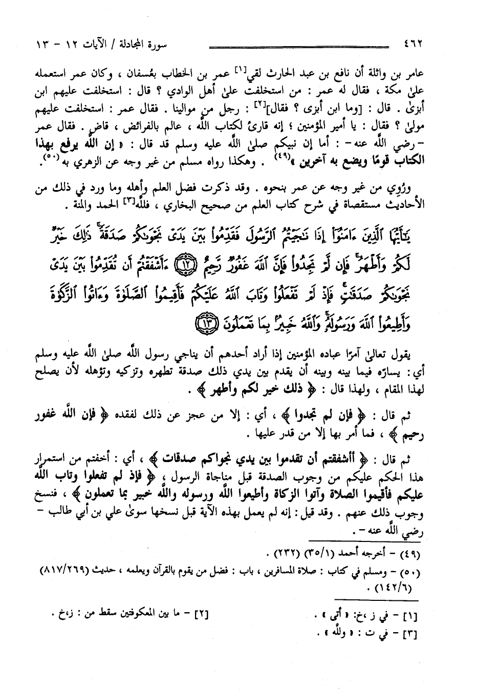 قَالَ تَعَالَى " أَأَشْفَقْتُمْ أَنْ تُقَدِّمُوا بَيْن يَدَيْ نَجْوَاكُمْ صَدَقَات " أَيْ أَخَفْتُمْ مِنْ اِسْتِمْرَار هَذَا الْحُكْم عَلَيْكُمْ مِنْ وُجُوب الصَّدَقَة قَبْل مُنَاجَاة الرَّسُول" فَإِذَا لَمْ تَفْعَلُوا وَتَابَ اللَّه عَلَيْكُمْ فَأَقِيمُوا الصَّلَاة وَآتُوا الزَّكَاة وَأَطِيعُوا اللَّه وَرَسُوله وَاَللَّه خَبِير بِمَا تَعْمَلُونَ " فَنَسَخَ وُجُوب ذَلِكَ عَنْهُمْ وَقَدْ قِيلَ إِنَّهُ لَمْ يَعْمَل بِهَذِهِ الْآيَة قَبْل نَسْخهَا سِوَى عَلِيّ بْن أَبِي طَالِب رَضِيَ اللَّه عَنْهُ