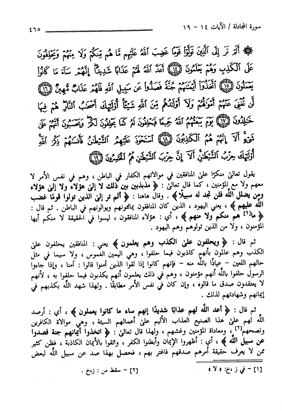 أَلَمْ تَرَ إِلَى الَّذِينَ تَوَلَّوْا قَوْمًا غَضِبَ اللَّهُ عَلَيْهِمْ مَا هُمْ مِنْكُمْ وَلَا مِنْهُمْ وَيَحْلِفُونَ عَلَى الْكَذِبِ وَهُمْ يَعْلَمُونَ
