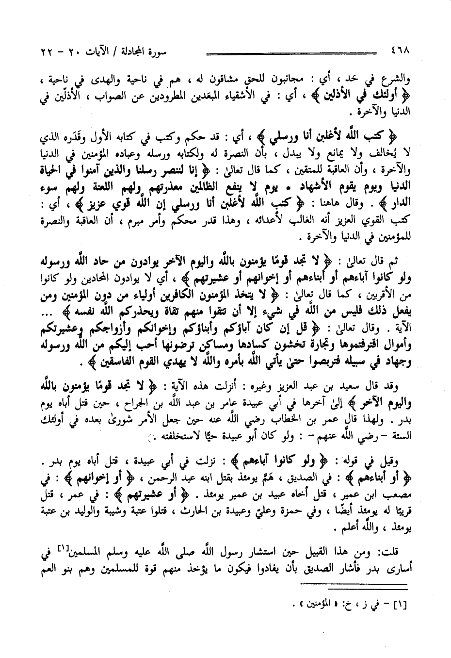 ثُمَّ قَالَ تَعَالَى " لَا تَجِد قَوْمًا يُؤْمِنُونَ بِاَللَّهِ وَالْيَوْم الْآخِر يُوَادُّونَ مَنْ حَادّ اللَّه وَرَسُوله وَلَوْ كَانُوا آبَاءَهُمْ أَوْ أَبْنَاءَهُمْ أَوْ إِخْوَانهمْ أَوْ عَشِيرَتهمْ" أَيْ لَا يُوَادُّونَ الْمُحَادِّينَ وَلَوْ كَانُوا مِنْ الْأَقْرَبِينَ كَمَا قَالَ تَعَالَى " لَا يَتَّخِذ الْمُؤْمِنُونَ الْكَافِرِينَ أَوْلِيَاء مِنْ دُون الْمُؤْمِنِينَ وَمَنْ يَفْعَل ذَلِكَ فَلَيْسَ مِنْ اللَّه فِي شَيْء إِلَّا أَنْ تَتَّقُوا مِنْهُمْ تُقَاة وَيُحَذِّركُمْ اللَّه نَفْسه " الْآيَة وَقَالَ تَعَالَى " قُلْ إِنْ كَانَ آبَاؤُكُمْ وَأَبْنَاؤُكُمْ وَإِخْوَانكُمْ وَأَزْوَاجكُمْ وَعَشِيرَتكُمْ وَأَمْوَال اِقْتَرَفْتُمُوهَا وَتِجَارَة تَخْشَوْنَ كَسَادهَا وَمَسَاكِن تَرْضَوْنَهَا أَحَبّ إِلَيْكُمْ مِنْ اللَّه وَرَسُوله وَجِهَاد فِي سَبِيله فَتَرَبَّصُوا حَتَّى يَأْتِي اللَّه بِأَمْرِهِ وَاَللَّه لَا يَهْدِي الْقَوْم الْفَاسِقِينَ " وَقَدْ قَالَ سَعِيد بْن عَبْد الْعَزِيز وَغَيْره أُنْزِلَتْ هَذِهِ الْآيَة" لَا تَجِد قَوْمًا يُؤْمِنُونَ بِاَللَّهِ وَالْيَوْم الْآخِر " إِلَى آخِرهَا فِي أَبِي عُبَيْدَة عَامِر بْن عَبْد اللَّه بْن الْجَرَّاح حِين قَتَلَ أَبَاهُ يَوْم بَدْر وَلِهَذَا قَالَ عُمَر بْن الْخَطَّاب رَضِيَ اللَّه عَنْهُ حِين جَعَلَ الْأَمْر شُورَى بَعْده فِي أُولَئِكَ السِّتَّة وَلَوْ كَانَ أَبُو عُبَيْدَة حَيًّا لَاسْتَخْلَفْته وَقِيلَ فِي قَوْله تَعَالَى " وَلَوْ كَانُوا آبَاءَهُمْ " نَزَلَتْ فِي أَبِي عُبَيْده قَتَلَ أَبَاهُ يَوْم بَدْر " أَوْ أَبْنَاءَهُمْ " فِي الصِّدِّيق هُمْ يَوْمئِذٍ بِقَتْلِ اِبْنه عَبْد الرَّحْمَن " أَوْ إِخْوَانهمْ" فِي مُصْعَب بْن عُمَيْر قَتَلَ أَخَاهُ عُبَيْد بْن عُمَيْر يَوْمئِذٍ" أَوْ عَشِيرَتهمْ " فِي عُمَر قَتَلَ قَرِيبًا لَهُ يَوْمئِذٍ أَيْضًا وَفِي حَمْزَة وَعَلِيّ وَعُبَيْدَة بْن الْحَارِث قَتَلُوا عُتْبَة وَشَيْبَة وَالْوَلِيد بْن عُتْبَة يَوْمئِذٍ فَاَللَّه أَعْلَم " قُلْت" وَمِنْ هَذَا الْقَبِيل حِين اِسْتَشَارَ رَسُول اللَّه صَلَّى اللَّه عَلَيْهِ وَسَلَّمَ الْمُسْلِمِينَ فِي أَسَارَى بَدْر فَأَشَارَ الصِّدِّيق بِأَنْ يُفَادُوا فَيَكُون مَا يُؤْخَذ مِنْهُمْ قُوَّة لِلْمُسْلِمِينَ وَهُمْ بَنُو الْعَمّ