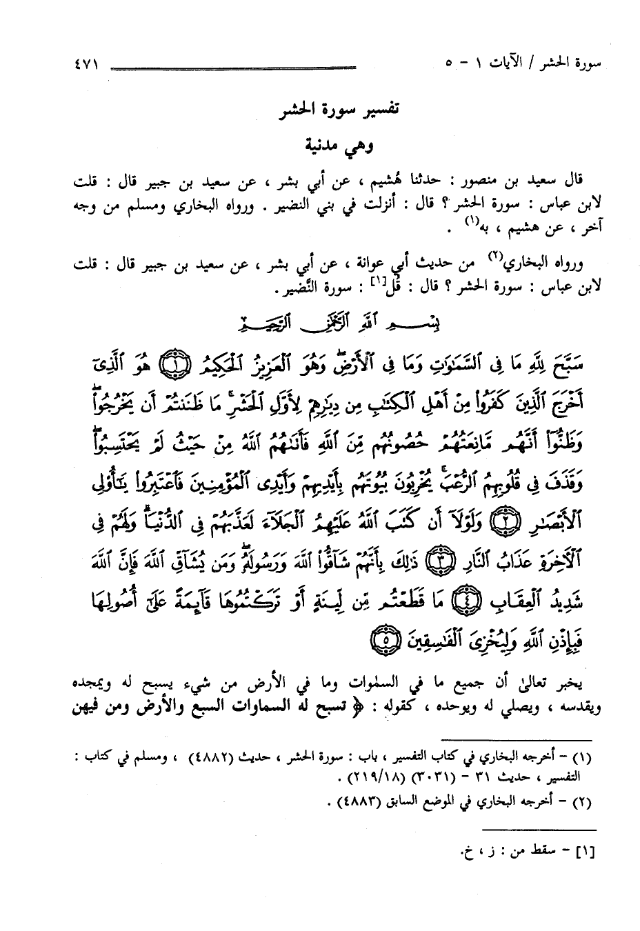 سُورَة الْحَشْر : " وَكَانَ اِبْن عَبَّاس يَقُول : سُورَة بَنِي النَّضِير " قَالَ سَعِيد بْن مَنْصُور حَدَّثَنَا هُشَيْم عَنْ أَبِي بِشْر عَنْ سَعِيد بْن جُبَيْر قَالَ : قُلْت لِابْنِ عَبَّاس سُورَة الْحَشْر ؟ قَالَ أُنْزِلَتْ فِي بَنِي النَّضِير وَرَوَاهُ الْبُخَارِيّ وَمُسْلِم مِنْ وَجْه آخَر عَنْ هُشَيْم بِهِ وَرَوَاهُ الْبُخَارِيّ مِنْ حَدِيث أَبِي عَوَانَة عَنْ أَبِي بِشْر عَنْ سَعِيد بْن جُبَيْر قَالَ : قُلْت لِابْنِ عَبَّاس سُورَة الْحَشْر ؟ قَالَ سُورَة بَنَى النَّضِير .