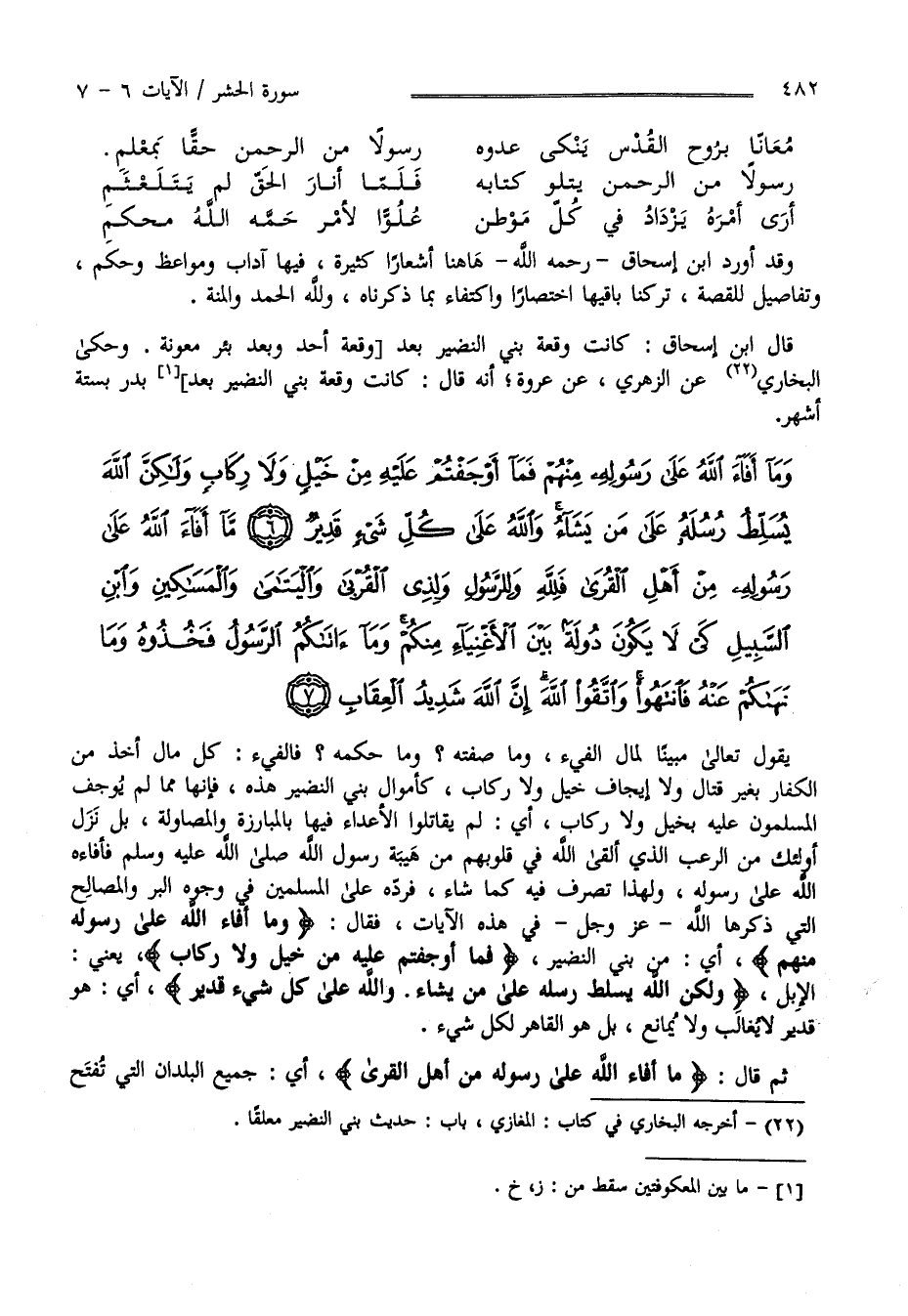 وَمَا أَفَاءَ اللَّهُ عَلَى رَسُولِهِ مِنْهُمْ فَمَا أَوْجَفْتُمْ عَلَيْهِ مِنْ خَيْلٍ وَلَا رِكَابٍ وَلَكِنَّ اللَّهَ يُسَلِّطُ رُسُلَهُ عَلَى مَنْ يَشَاءُ وَاللَّهُ عَلَى كُلِّ شَيْءٍ قَدِيرٌ