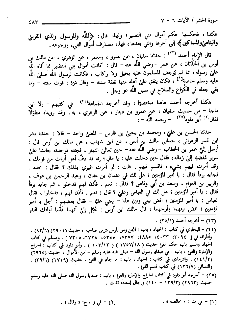 قَالَ الْإِمَام أَحْمَد حَدَّثَنَا سُفْيَان عَنْ عَمْرو وَمَعْمَر عَنْ الزُّهْرِيّ عَنْ مَالِك بْن أَوْس بْن الْحَدَثَانِ عَنْ عُمَر رَضِيَ اللَّه عَنْهُ قَالَ : كَانَتْ أَمْوَال بَنِي النَّضِير مِمَّا أَفَاءَ اللَّه إِلَى رَسُوله مِمَّا لَمْ يُوجِف الْمُسْلِمُونَ عَلَيْهِ بِخَيْلٍ وَلَا رِكَاب فَكَانَتْ لِرَسُولِ اللَّه صَلَّى اللَّه عَلَيْهِ وَسَلَّمَ خَالِصَة فَكَانَ يُنْفِق عَلَى أَهْله مِنْهَا نَفَقَة سَنَته وَقَالَ مَرَّة قُوت سَنَته وَمَا بَقِيَ جَعَلَهُ فِي الْكُرَاع وَالسِّلَاح فِي سَبِيل اللَّه عَزَّ وَجَلَّ هَكَذَا أَخْرَجَهُ أَحْمَد هَهُنَا مُخْتَصَرًا وَقَدْ أَخْرَجَهُ الْجَمَاعَة فِي كُتُبهمْ إِلَّا اِبْن مَاجَهْ مِنْ حَدِيث سُفْيَان عَنْ عَمْرو بْن دِينَار عَنْ الزُّهْرِيّ بِهِ وَقَدْ رُوِّينَاهُ مُطَوَّلًا وَقَالَ أَبُو دَاوُد رَحِمَهُ اللَّه حَدَّثَنَا الْحَسَن بْن عَلِيّ وَمُحَمَّد بْن يَحْيَى بْن فَارِس الْمَعْنَى وَاحِد قَالَا حَدَّثَنَا بِشْر بْن عَمْرو الزَّهْرَانِيّ حَدَّثَنِي مَالِك بْن أَنَس عَنْ اِبْن شِهَاب عَنْ مَالِك بْن أَوْس قَالَ أَرْسَلَ إِلَى عُمَر بْن الْخَطَّاب رَضِيَ اللَّه عَنْهُ حِين تَعَالَى النَّهَار فَجِئْته فَوَجَدْته جَالِسًا عَلَى سَرِير مُفْضِيًا إِلَى رِمَاله فَقَالَ حِين دَخَلْت عَلَيْهِ : يَا مَال إِنَّهُ قَدْ دَفَّ أَهْل أَبْيَات مِنْ قَوْمك وَقَدْ أَمَرْت فِيهِمْ بِشَيْءٍ فَاقْسِمْ فِيهِمْ قُلْت لَوْ أَمَرْت غَيْرِي بِذَلِكَ فَقَالَ خُذْهُ فَجَاءَهُ يَرْفَأ فَقَالَ يَا أَمِير الْمُؤْمِنِينَ هَلْ لَك فِي عُثْمَان بْن عَفَّان وَعَبْد الرَّحْمَن بْن عَوْف وَالزُّبَيْر بْن الْعَوَّام وَسَعْد بْن أَبِي وَقَّاص ؟ قَالَ نَعَمْ فَأَذِنَ لَهُمْ فَدَخَلُوا ثُمَّ جَاءَهُ يَرْفَأ فَقَالَ يَا أَمِير الْمُؤْمِنِينَ هَلْ لَك فِي الْعَبَّاس وَعَلِيّ ؟ قَالَ نَعَمْ فَأَذِنَ لَهُمَا فَدَخَلَا فَقَالَ الْعَبَّاس يَا أَمِير الْمُؤْمِنِينَ اقْضِ بَيْنِي وَبَيْن هَذَا يَعْنِي عَلِيًّا فَقَالَ بَعْضهمْ أَجَلْ يَا أَمِير الْمُؤْمِنِينَ اِقْضِ بَيْنهمَا وَأَرِحْهُمَا قَالَ مَالِك بْن أَوْس خُيِّلَ إِلَيَّ أَنَّهُمَا قَدِمَا أُولَئِكَ النَّفَر