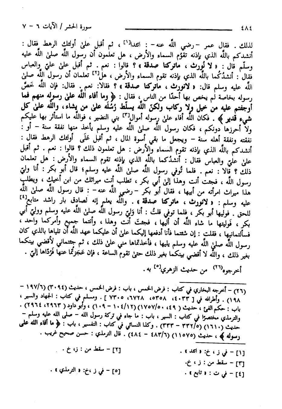 لِذَلِكَ فَقَالَ عُمَر رَضِيَ اللَّه عَنْهُ اِتَّئِدْ ثُمَّ أَقْبَلَ عَلَى أُولَئِكَ الرَّهْط فَقَالَ : أَنْشُدكُمْ بِاَللَّهِ الَّذِي بِإِذْنِهِ تَقُوم السَّمَاء وَالْأَرْض هَلْ تَعْلَمُونَ أَنَّ رَسُول اللَّه صَلَّى اللَّه عَلَيْهِ وَسَلَّمَ قَالَ " لَا نُورَث مَا تَرَكْنَا صَدَقَة " قَالُوا نَعَمْ ثُمَّ أَقْبَلَ عَلَى عَلِيّ وَالْعَبَّاس فَقَالَ أَنْشُدكُمَا بِاَللَّهِ الَّذِي بِإِذْنِهِ تَقُوم السَّمَاء وَالْأَرْض هَلْ تَعْلَمَانِ أَنَّ رَسُول اللَّه صَلَّى اللَّه عَلَيْهِ وَسَلَّمَ قَالَ " لَا نُورَث مَا تَرَكْنَا صَدَقَة " فَقَالَا نَعَمْ فَقَالَ إِنَّ اللَّه خَصَّ رَسُوله بِخَاصَّةٍ لَمْ يَخُصّ بِهَا أَحَدًا مِنْ النَّاس قَالَ تَعَالَى " وَمَا أَفَاءَ اللَّه عَلَى رَسُوله مِنْهُمْ فَمَا أَوْجَفْتُمْ عَلَيْهِ مِنْ خَيْل وَلَا رِكَاب وَلَكِنَّ اللَّه يُسَلِّط رُسُله عَلَى مَنْ يَشَاء وَاَللَّه عَلَى كُلّ شَيْء قَدِير " فَكَانَ اللَّه تَعَالَى أَفَاءَ إِلَى رَسُوله أَمْوَال بَنِي النَّضِير فَوَاَللَّهِ مَا اِسْتَأْثَرَ بِهَا عَلَيْكُمْ وَلَا أَحْرَزَهَا دُونكُمْ فَكَانَ رَسُول اللَّه صَلَّى اللَّه عَلَيْهِ وَسَلَّمَ يَأْخُذ مِنْهَا نَفَقَة سَنَة أَوْ نَفَقَته وَنَفَقَة أَهْله