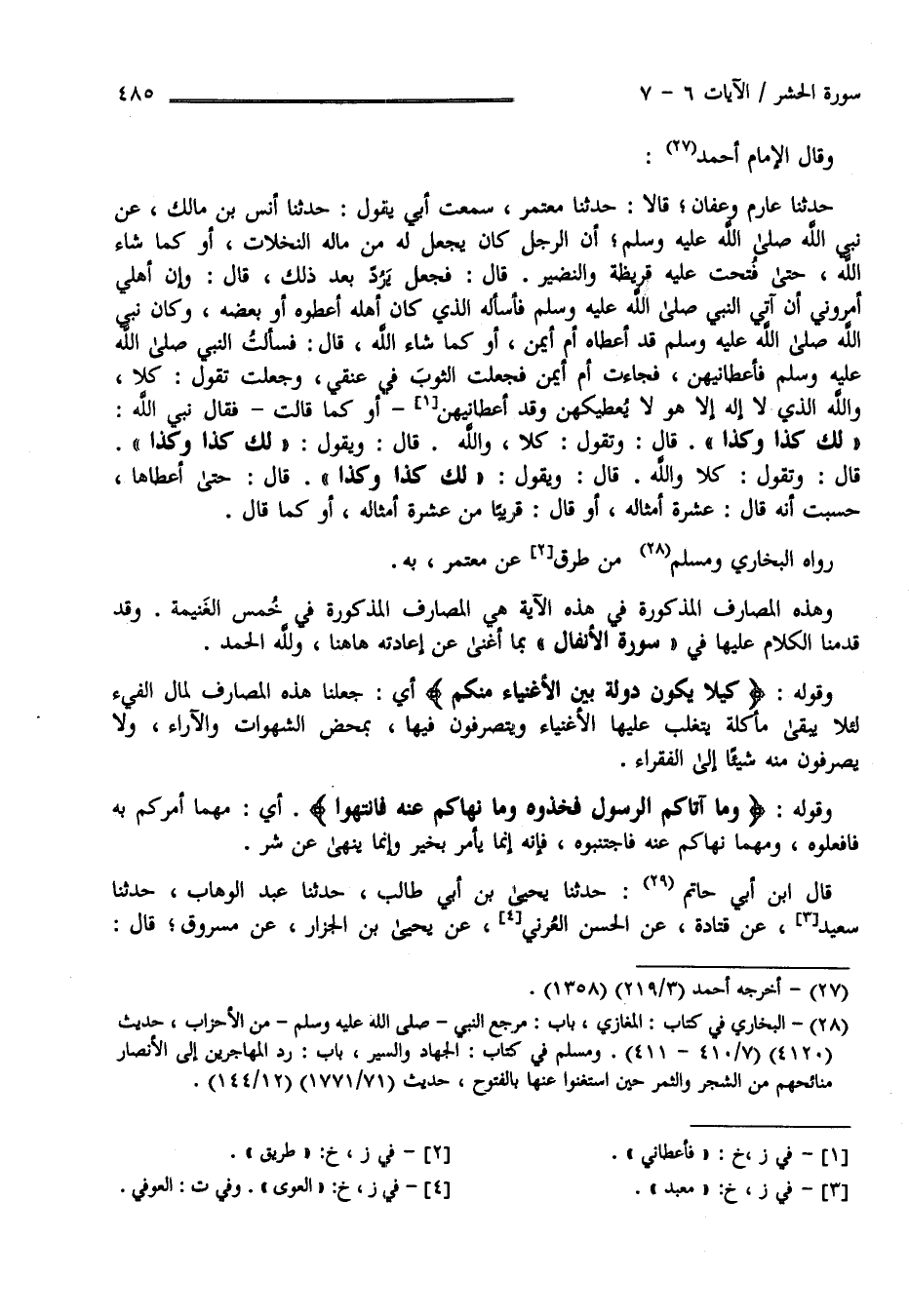 رَوَاهُ الْبُخَارِيّ وَمُسْلِم مِنْ طُرُق عَنْ مَعْمَر بِهِ وَهَذِهِ الْمَصَارِف الْمَذْكُورَة فِي هَذِهِ الْآيَة هِيَ الْمَصَارِف الْمَذْكُورَة فِي خُمُس الْغَنِيمَة وَقَدْ قَدَّمْنَا الْكَلَام عَلَيْهَا فِي سُورَة الْأَنْفَال بِمَا أَغْنَى عَنْ إِعَادَته هَهُنَا وَلِلَّهِ الْحَمْد وَقَوْله تَعَالَى " كَيْلَا يَكُون دُولَة بَيْن الْأَغْنِيَاء مِنْكُمْ " أَيْ جَعَلْنَا هَذِهِ الْمَصَارِف لِمَالِ الْفَيْء كَيْلَا يَبْقَى مَأْكَلَة يَتَغَلَّب عَلَيْهَا الْأَغْنِيَاء وَيَتَصَرَّفُونَ فِيهَا بِمَحْضِ الشَّهَوَات وَالْآرَاء وَلَا يَصْرِفُونَ مِنْهُ شَيْئًا إِلَى الْفُقَرَاء وَقَوْله تَعَالَى " وَمَا آتَاكُمْ الرَّسُول فَخُذُوهُ وَمَا نَهَاكُمْ عَنْهُ فَانْتَهُوا " أَيْ مَهْمَا أَمَرَكُمْ بِهِ فَافْعَلُوهُ وَمَهْمَا نَهَاكُمْ عَنْهُ فَاجْتَنِبُوهُ فَإِنَّهُ إِنَّمَا يَأْمُر بِخَيْرٍ وَإِنَّمَا يَنْهَى عَنْ شَرّ قَالَ اِبْن أَبِي حَاتِم حَدَّثَنَا يَحْيَى بْن أَبِي طَالِب حَدَّثَنَا عَبْد الْوَهَّاب حَدَّثَنَا سَعِيد عَنْ قَتَادَة عَنْ الْحَسَن الْعَوْفِيّ عَنْ يَحْيَى بْن الْجَزَّار عَنْ مَسْرُوق قَالَ