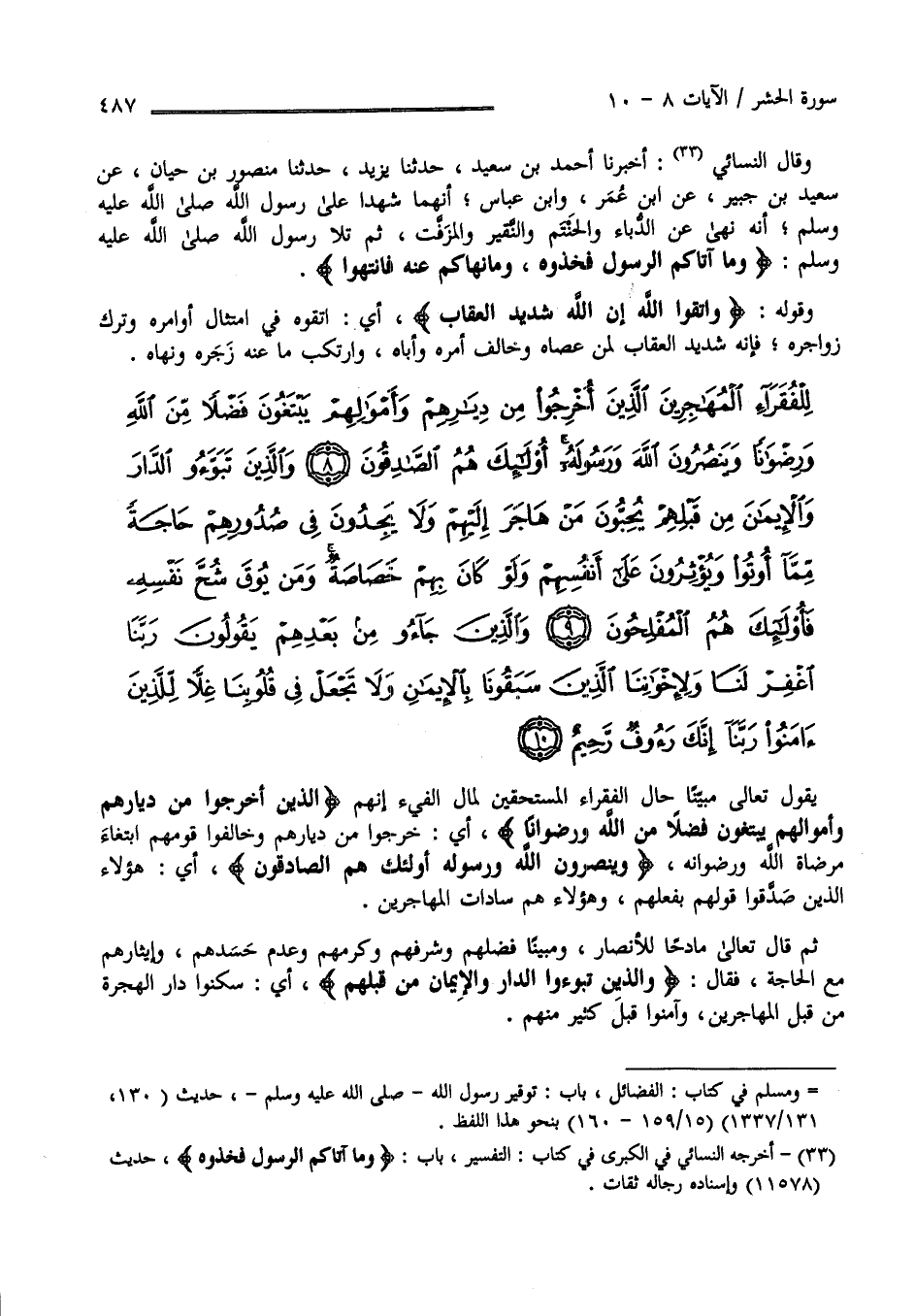 " وَقَالَ النَّسَائِيّ أَخْبَرَنَا أَحْمَد بْن سَعِيد حَدَّثَنَا يَزِيد حَدَّثَنَا مَنْصُور بْن حَيَّان عَنْ سَعِيد بْن جُبَيْر عَنْ عُمَر وَابْن عَبَّاس أَنَّهُمَا شَهِدَا عَلَى رَسُول اللَّه صَلَّى اللَّه عَلَيْهِ وَسَلَّمَ أَنَّهُ نَهَى عَنْ الدُّبَّاء وَالْحَنْتَم وَالنَّقِير وَالْمُزَفَّت ثُمَّ تَلَا رَسُول اللَّه صَلَّى اللَّه عَلَيْهِ وَسَلَّمَ " وَمَا آتَاكُمْ الرَّسُول فَخُذُوهُ وَمَا نَهَاكُمْ عَنْهُ فَانْتَهُوا " وَقَوْله تَعَالَى " وَاتَّقُوا اللَّه إِنَّ اللَّه شَدِيد الْعِقَاب " أَيْ اِتَّقُوهُ فِي اِمْتِثَال أَوَامِره وَتَرْك زَوَاجِره فَإِنَّهُ شَدِيد الْعِقَاب لِمَنْ عَصَاهُ وَخَالَفَ أَمْره وَأَبَاهُ وَارْتَكَبَ مَا عَنْهُ زَجَرَهُ وَنَهَاهُ .