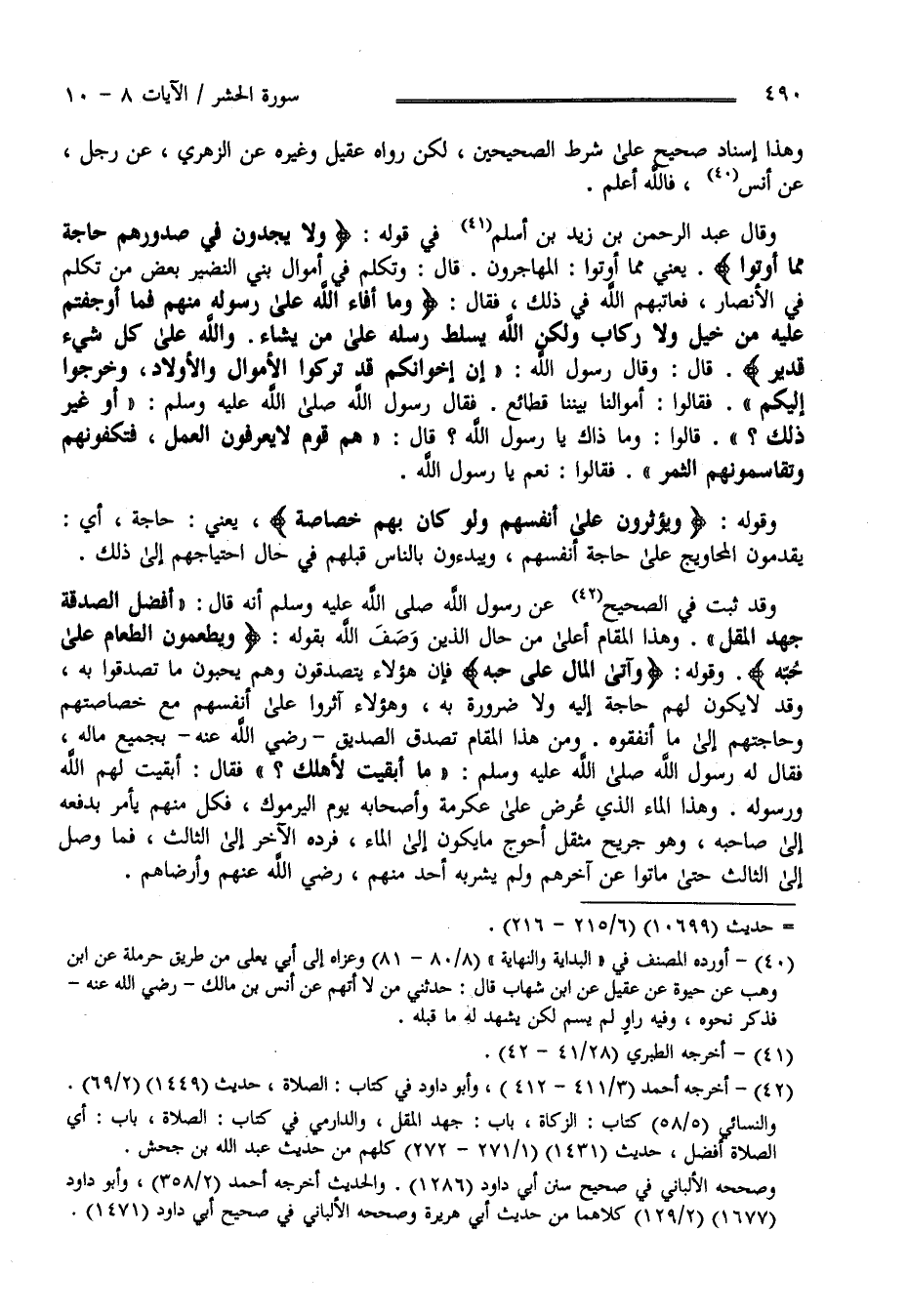 وَقَالَ عَبْد الرَّحْمَن بْن زَيْد بْن أَسْلَم فِي قَوْله تَعَالَى " وَلَا يَجِدُونَ فِي صُدُورهمْ حَاجَة مِمَّا أُوتُوا " يَعْنِي مِمَّا أُوتُوا الْمُهَاجِرُونَ قَالَ وَتَكَلَّمَ فِي أَمْوَال بَنِي النَّضِير بَعْض مَنْ تَكَلَّمَ فِي الْأَنْصَار فَعَاتَبَهُمْ اللَّه فِي ذَلِكَ فَقَالَ تَعَالَى " وَمَا أَفَاءَ اللَّه عَلَى رَسُوله مِنْهُمْ فَمَا أَوْجَفْتُمْ عَلَيْهِ مِنْ خَيْل وَلَا رِكَاب وَلَكِنَّ اللَّه يُسَلِّط رُسُله عَلَى مَنْ يَشَاء وَاَللَّه عَلَى كُلّ شَيْء قَدِير " قَالَ : وَقَالَ رَسُول اللَّه صَلَّى اللَّه عَلَيْهِ وَسَلَّمَ " إِنَّ إِخْوَانكُمْ قَدْ تَرَكُوا الْأَمْوَال وَالْأَوْلَاد وَخَرَجُوا إِلَيْكُمْ " فَقَالُوا أَمْوَالنَا بَيْننَا قَطَائِع فَقَالَ رَسُول اللَّه صَلَّى اللَّه عَلَيْهِ وَسَلَّمَ " أَوَغَيْر ذَلِكَ " قَالُوا وَمَا ذَاكَ يَا رَسُول اللَّه ؟ قَالَ " هُمْ قَوْم لَا يَعْرِفُونَ الْعَمَل فَتَكْفُونَهُمْ وَتُقَاسِمُونَهُمْ الثَّمَر " فَقَالُوا نَعَمْ يَا رَسُول اللَّه .