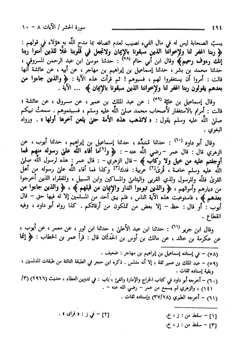 يَسُبّ الصَّحَابَة لَيْسَ لَهُ فِي مَال الْفَيْء نَصِيب لِعَدَمِ اِتِّصَافه بِمَا مَدَحَ اللَّه بِهِ هَؤُلَاءِ فِي قَوْلهمْ " رَبّنَا اِغْفِرْ لَنَا وَلِإِخْوَانِنَا الَّذِينَ سَبَقُونَا بِالْإِيمَانِ وَلَا تَجْعَل فِي قُلُوبنَا غِلًّا لِلَّذِينَ آمَنُوا رَبّنَا إِنَّك رَءُوف رَحِيم " وَقَالَ اِبْن أَبِي حَاتِم حَدَّثَنَا مُوسَى بْن عَبْد الرَّحْمَن الْمَسْرُوقِيّ حَدَّثَنَا مُحَمَّد بْن بِشْر حَدَّثَنَا إِسْمَاعِيل بْن إِبْرَاهِيم بْن مُهَاجِر عَنْ أَبِيهِ عَنْ عَائِشَة أَنَّهَا قَالَتْ : أُمِرُوا أَنْ يَسْتَغْفِرُوا لَهُمْ فَسَبُّوهُمْ ثُمَّ قَرَأْت هَذِهِ الْآيَة " وَاَلَّذِينَ جَاءُوا مِنْ بَعْدهمْ يَقُولُونَ رَبّنَا اِغْفِرْ لَنَا وَلِإِخْوَانِنَا الَّذِينَ سَبَقُونَا بِالْإِيمَانِ " الْآيَة وَقَالَ إِسْمَاعِيل اِبْن عُلَيَّة عَنْ عَبْد الْمَلِك بْن عُمَيْر عَنْ مَسْرُوق عَنْ عَائِشَة قَالَتْ : أُمِرْتُمْ بِالِاسْتِغْفَارِ لِأَصْحَابِ مُحَمَّد صَلَّى اللَّه عَلَيْهِ وَسَلَّمَ فَسَبَبْتُمُوهُمْ سَمِعْت نَبِيّكُمْ صَلَّى اللَّه عَلَيْهِ وَسَلَّمَ يَقُول : " لَا تَذْهَب هَذِهِ الْأُمَّة حَتَّى يَلْعَن آخِرُهَا أَوَّلَهَا" رَوَاهُ الْبَغَوِيّ وَقَالَ أَبُو دَاوُد حَدَّثَنَا مُسَدَّد حَدَّثَنَا إِسْمَاعِيل بْن إِبْرَاهِيم حَدَّثَنَا أَيُّوب عَنْ الزُّهْرِيّ قَالَ : قَالَ عُمَر رَضِيَ اللَّه عَنْهُ " وَمَا أَفَاءَ اللَّه عَلَى رَسُوله مِنْهُمْ فَمَا أَوْجَفْتُمْ عَلَيْهِ مِنْ خَيْل وَلَا رِكَاب " قَالَ الزُّهْرِيّ : قَالَ عُمَر رَضِيَ اللَّه عَنْهُ : هَذِهِ لِرَسُولِ اللَّه صَلَّى اللَّه عَلَيْهِ وَسَلَّمَ خَاصَّة وَقُرَى عُرَيْنَة وَكَذَا وَكَذَا مِمَّا أَفَاءَ اللَّه عَلَى رَسُوله مِنْ أَهْل الْقُرَى فَلِلَّهِ وَلِلرَّسُولِ وَلِذِي الْقُرْبَى وَالْيَتَامَى وَالْمَسَاكِين وَابْن السَّبِيل وَلِلْفُقَرَاءِ الْمُهَاجِرِينَ الَّذِينَ أُخْرِجُوا مِنْ دِيَارهمْ وَأَمْوَالهمْ - وَاَلَّذِينَ تَبَوَّءُوا الدَّار وَالْإِيمَان مِنْ قَبْلهمْ - وَاَلَّذِينَ جَاءُوا مِنْ بَعْدهمْ فَاسْتَوْعَبَتْ هَذِهِ الْآيَة النَّاس فَلَمْ يَبْقَ أَحَد مِنْ الْمُسْلِمِينَ إِلَّا لَهُ فِيهَا حَقّ - قَالَ أَيُّوب - أَوْ قَالَ حَظّ إِلَّا بَعْض مِنْ تَمْلِكُونَ مِنْ أَرِقَّائِكُمْ .