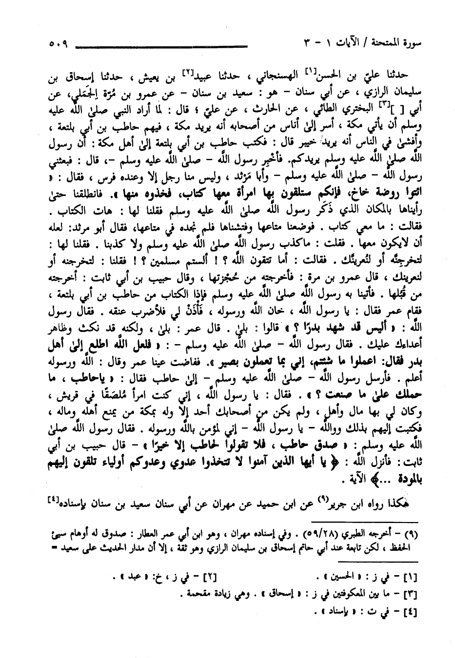 حَدَّثَنَا عَلِيّ بْن الْحَسَن الْهِسِنْجَانِيّ حَدَّثَنَا عُبَيْد بْن يَعِيش حَدَّثَنَا إِسْحَاق بْن سُلَيْمَان الرَّازِيّ عَنْ أَبِي سِنَان هُوَ سَعِيد بْن سِنَان عَنْ عَمْرو بْن مُرَّة الْحِمْلِيّ عَنْ أَبِي إِسْحَاق الْبُحْتُرِيّ الطَّائِيّ عَنْ الْحَارِث عَنْ عَلِيّ لَمَّا أَرَادَ النَّبِيّ صَلَّى اللَّه عَلَيْهِ وَسَلَّمَ أَنْ يَأْتِي مَكَّة أَسَرَّ إِلَى أُنَاس مِنْ أَصْحَابه أَنَّهُ يُرِيد مَكَّة مِنْهُمْ حَاطِب بْن أَبِي بَلْتَعَةَ وَأَفْشَى فِي النَّاس أَنَّهُ يُرِيد خَيْبَر قَالَ فَكَتَبَ حَاطِب بْن أَبِي بَلْتَعَةَ إِلَى أَهْل مَكَّة أَنَّ رَسُول اللَّه صَلَّى اللَّه عَلَيْهِ وَسَلَّمَ يُرِيدكُمْ فَأَخْبَرَ رَسُول اللَّه صَلَّى اللَّه عَلَيْهِ وَسَلَّمَ قَالَ فَبَعَثَنِي رَسُول اللَّه صَلَّى اللَّه عَلَيْهِ وَسَلَّمَ وَأَبَا مَرْثَد وَلَيْسَ مِنَّا رَجُل إِلَّا وَعِنْده فَرَس فَقَالَ " اِئْتُوا رَوْضَة خَاخ فَإِنَّكُمْ سَتَلْقَوْنَ بِهَا اِمْرَأَة مَعَهَا كِتَاب فَخُذُوهُ مِنْهَا " فَانْطَلَقْنَا حَتَّى رَأَيْنَاهَا بِالْمَكَانِ الَّذِي ذَكَرَ رَسُول اللَّه صَلَّى اللَّه عَلَيْهِ وَسَلَّمَ فَقُلْنَا لَهَا هَاتِ الْكِتَاب فَقَالَتْ مَا مَعِي كِتَاب فَوَضَعْنَا مَتَاعهَا وَفَتَّشْنَاهَا فَلَمْ نَجِدهُ فِي مَتَاعهَا فَقَالَ أَبُو مَرْثَد لَعَلَّهُ أَنْ لَا يَكُون مَعَهَا فَقُلْت مَا كَذَبَ رَسُول اللَّه صَلَّى اللَّه عَلَيْهِ وَسَلَّمَ وَلَا كَذَبْنَا فَقُلْنَا لَهَا لَتُخْرِجِنَّهُ أَوْ لَنُعَرِّيَنَّك فَقَالَتْ أَمَا تَتَّقُونَ اللَّه ؟ أَلَسْتُمْ مُسْلِمِينَ ؟ فَقُلْنَا لَتُخْرِجِنَّهُ أَوْ لَنُعَرِّيَنَّك قَالَ عَمْرو بْن مُرَّة فَأَخْرَجَتْهُ مِنْ حُجْزَتهَا وَقَالَ حَبِيب بْن أَبِي ثَابِت أَخْرَجَتْهُ مِنْ قُبُلهَا فَأَتَيْنَا بِهِ رَسُول اللَّه صَلَّى اللَّه عَلَيْهِ وَسَلَّمَ فَإِذَا الْكِتَاب مِنْ حَاطِب بْن أَبِي بَلْتَعَةَ فَقَامَ عُمَر فَقَالَ يَا رَسُول اللَّه خَانَ اللَّه وَرَسُوله فَأْذَنْ لِي فَلِأَضْرِب عُنُقه فَقَالَ رَسُول اللَّه صَلَّى اللَّه عَلَيْهِ وَسَلَّمَ " أَلَيْسَ قَدْ شَهِدَ بَدْرًا ؟ " قَالُوا بَلَى وَقَالَ عُمَر بَلَى وَلَكِنَّهُ قَدْ نَكَثَ وَظَاهَرَ أَعْدَاءَك عَلَيْك فَقَالَ رَسُول اللَّه صَلَّى اللَّه عَلَيْهِ وَسَلَّمَ " فَلَعَلَّ اللَّه اِطَّلَعَ عَلَى أَهْل بَدْر فَقَالَ اِعْمَلُوا مَا شِئْتُمْ إِنِّي بِمَا تَعْمَلُونَ بَصِير" فَفَاضَتْ عَيْنَا عُمَر وَقَالَ اللَّه وَرَسُوله أَعْلَم فَأَرْسَلَ رَسُول اللَّه صَلَّى اللَّه عَلَيْهِ وَسَلَّمَ إِلَى حَاطِب فَقَالَ" يَا حَاطِب مَا حَمَلَك عَلَى مَا صَنَعْت ؟ " فَقَالَ يَا رَسُول اللَّه إِنِّي كُنْت اِمْرَأً مُلْصَقًا فِي قُرَيْش وَكَانَ لِي بِهَا مَال وَأَهْل وَلَمْ يَكُنْ مِنْ أَصْحَابك أَحَد إِلَّا وَلَهُ بِمَكَّة مَنْ يَمْنَع أَهْله وَمَاله فَكَتَبْت بِذَلِكَ إِلَيْهِمْ وَوَاللَّهِ يَا رَسُول اللَّه إِنِّي لَمُؤْمِن بِاَللَّهِ وَرَسُوله فَقَالَ رَسُول اللَّه صَلَّى اللَّه عَلَيْهِ وَسَلَّمَ " صَلَّى حَاطِب فَلَا تَقُولُوا لِحَاطِبٍ إِلَّا خَيْرًا " قَالَ حَبِيب بْن أَبِي ثَابِت فَأَنْزَلَ اللَّه تَعَالَى " يَا أَيّهَا الَّذِينَ آمَنُوا لَا تَتَّخِذُوا عَدُوِّي وَعَدُوّكُمْ أَوْلِيَاء تُلْقُونَ إِلَيْهِمْ بِالْمَوَدَّةِ " الْآيَة وَهَكَذَا رَوَاهُ اِبْن جَرِير عَنْ اِبْن حُمَيْد عَنْ