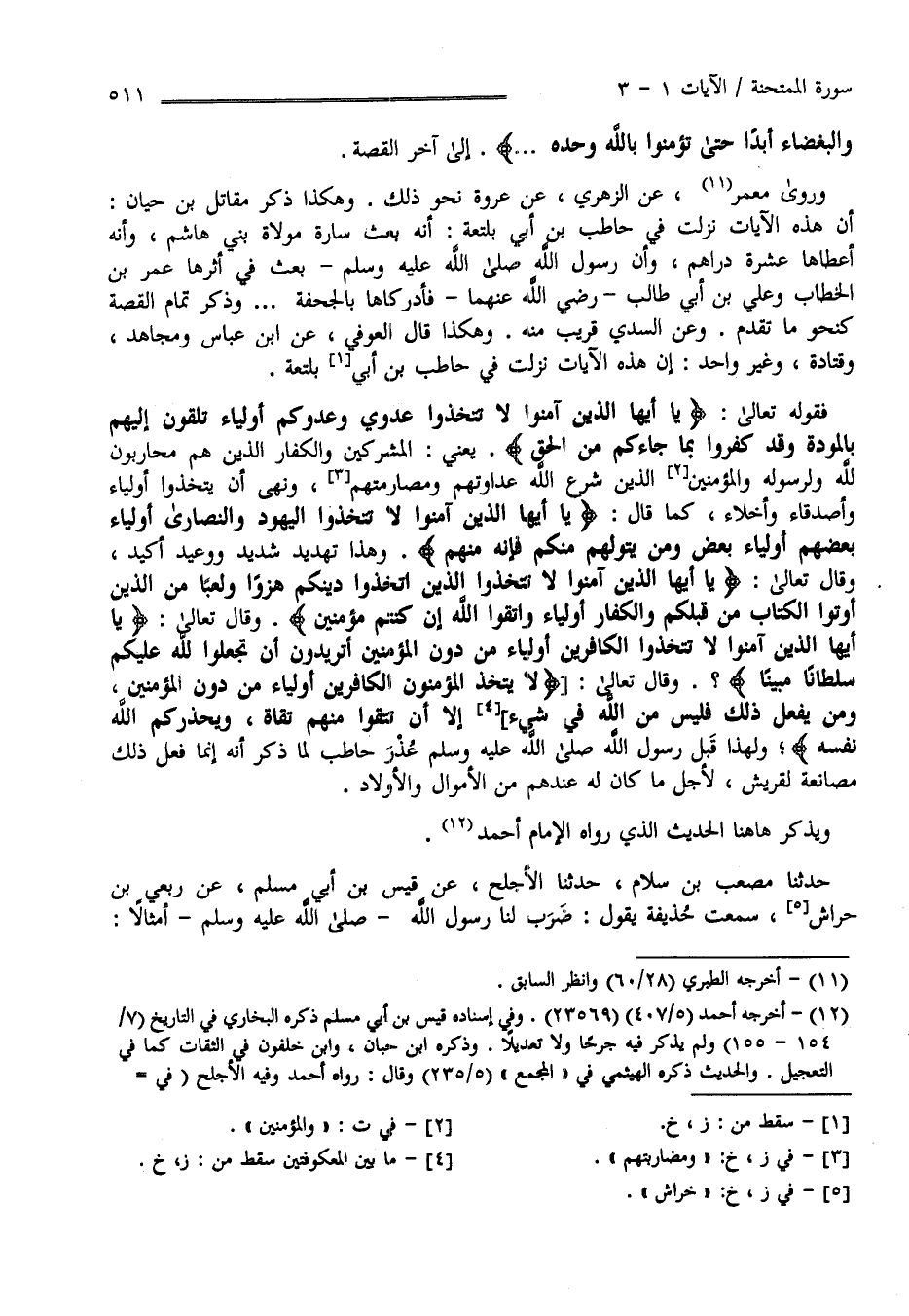 صَلَّى اللَّه عَلَيْهِ وَسَلَّمَ بَعَثَ فِي أَثَرهَا عُمَر بْن الْخَطَّاب وَعَلِيّ بْن أَبِي طَالِب رَضِيَ اللَّه عَنْهُمَا فَأَدْرَكَاهَا بِالْجُحْفَةِ وَذَكَرَ تَمَام الْقِصَّة كَنَحْوِ مَا تَقَدَّمَ وَعَنْ السُّدِّيّ قَرِيبًا مِنْهُ وَهَكَذَا قَالَ الْعَوْفِيّ عَنْ اِبْن عَبَّاس وَمُجَاهِد وَقَتَادَة وَغَيْر وَاحِد أَنَّ هَذِهِ الْآيَات نَزَلَتْ فِي حَاطِب بْن أَبِي بَلْتَعَةَ فَقَوْله تَعَالَى " يَا أَيّهَا الَّذِينَ آمَنُوا لَا تَتَّخِذُوا عَدُوِّي وَعَدُوّكُمْ أَوْلِيَاء تُلْقُونَ إِلَيْهِمْ بِالْمَوَدَّةِ وَقَدْ كَفَرُوا بِمَا جَاءَكُمْ مِنْ الْحَقّ " يَعْنِي الْمُشْرِكِينَ وَالْكُفَّار الَّذِينَ هُمْ مُحَارِبُونَ لِلَّهِ وَلِرَسُولِهِ وَلِلْمُؤْمِنِينَ الَّذِينَ شَرَعَ اللَّه عَدَاوَتهمْ وَمُصَارَمَتهمْ وَنَهَى أَنْ يُتَّخَذُوا أَوْلِيَاء وَأَصْدِقَاء وَأَخِلَّاء كَمَا قَالَ تَعَالَى " يَا أَيّهَا الَّذِينَ آمَنُوا لَا تَتَّخِذُوا الْيَهُود وَالنَّصَارَى أَوْلِيَاء بَعْضهمْ أَوْلِيَاء بَعْض وَمَنْ يَتَوَلَّهُمْ مِنْكُمْ فَإِنَّهُ مِنْهُمْ" وَهَذَا تَهْدِيد شَدِيد وَوَعِيد أَكِيد وَقَالَ تَعَالَى " يَا أَيّهَا الَّذِينَ آمَنُوا لَا تَتَّخِذُوا الَّذِينَ اِتَّخَذُوا دِينكُمْ هُزُوًا وَلَعِبًا مِنْ الَّذِينَ أُوتُوا الْكِتَاب مِنْ قَبْلكُمْ وَالْكُفَّار أَوْلِيَاء وَاتَّقُوا اللَّه إِنْ كُنْتُمْ مُؤْمِنِينَ " .