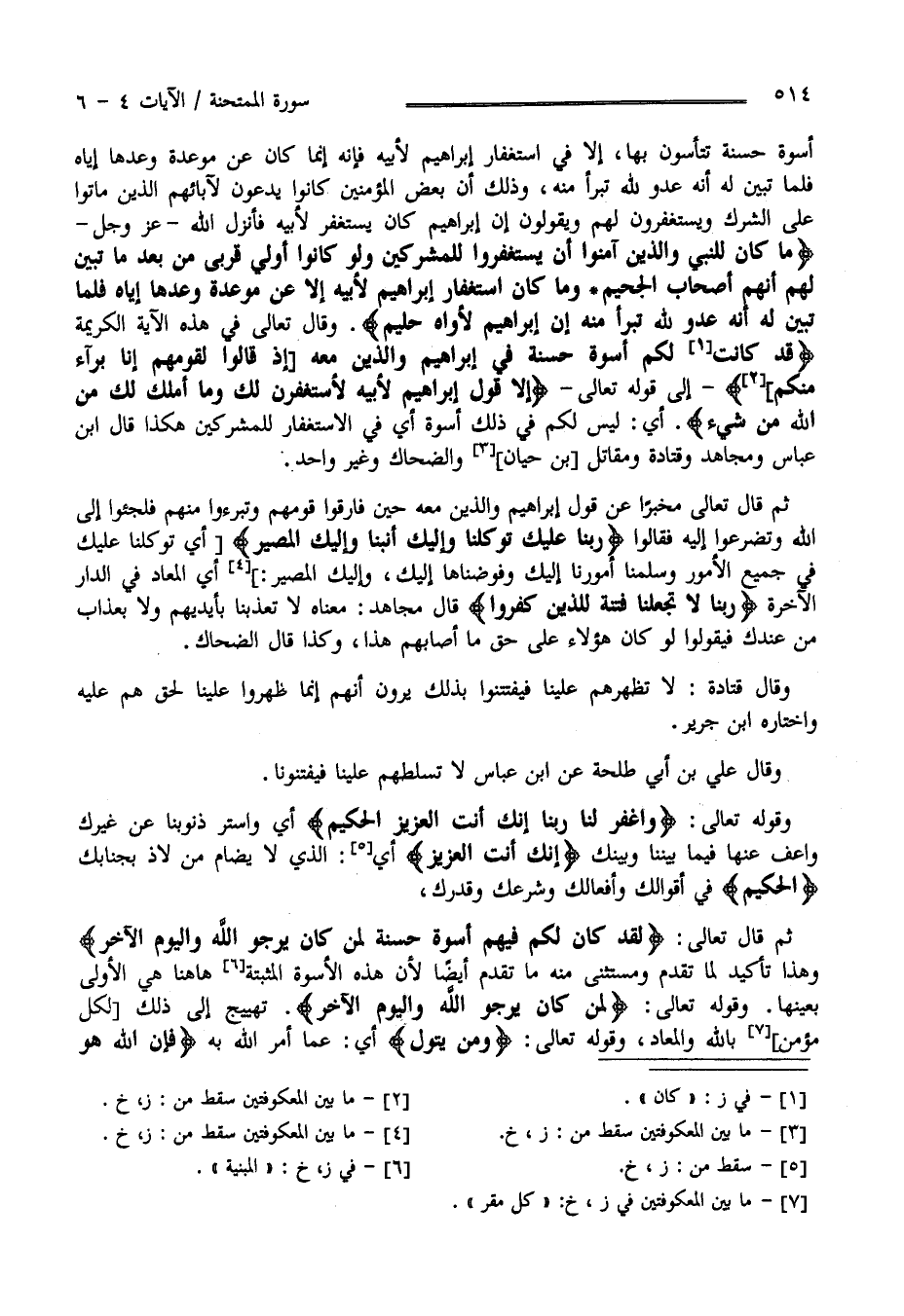 أُسْوَة حَسَنَة تَأَسَّوْنَ بِهَا إِلَّا فِي اِسْتِغْفَار إِبْرَاهِيم لِأَبِيهِ فَإِنَّهُ إِنَّمَا كَانَ عَنْ مَوْعِدَة وَعَدَهَا إِيَّاهُ فَلَمَّا تَبَيَّنَ لَهُ أَنَّهُ عَدُوّ لِلَّهِ تَبَرَّأَ مِنْهُ " وَذَلِكَ أَنَّ بَعْض الْمُؤْمِنِينَ كَانُوا يَدْعُونَ لِآبَائِهِمْ الَّذِينَ مَاتُوا عَلَى الشِّرْك وَيَسْتَغْفِرُونَ لَهُمْ وَيَقُولُونَ إِنَّ إِبْرَاهِيم كَانَ يَسْتَغْفِر لِأَبِيهِ فَأَنْزَلَ اللَّه عَزَّ وَجَلَّ " مَا كَانَ لِلنَّبِيِّ وَاَلَّذِينَ آمَنُوا أَنْ يَسْتَغْفِرُوا لِلْمُشْرِكِينَ وَلَوْ كَانُوا أُولَى قُرْبَى مِنْ بَعْد مَا تَبَيَّنَ لَهُمْ أَنَّهُمْ أَصْحَاب الْجَحِيم وَمَا كَانَ اِسْتِغْفَار إِبْرَاهِيم لِأَبِيهِ إِلَّا عَنْ مَوْعِدَة وَعَدَهَا إِيَّاهُ فَلَمَّا تَبَيَّنَ لَهُ أَنَّهُ عَدُوّ لِلَّهِ تَبَرَّأَ مِنْهُ إِنَّ إِبْرَاهِيم لَأَوَّاه حَلِيم " .