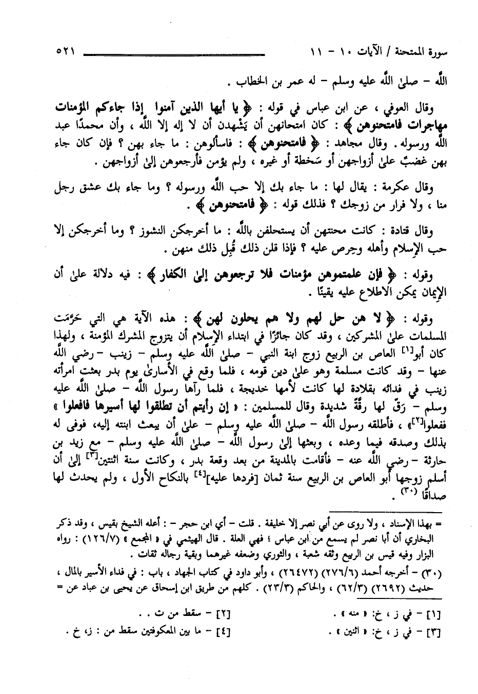 اللَّه صَلَّى اللَّه عَلَيْهِ وَسَلَّمَ لَهُ عُمَر بْن الْخَطَّاب رَضِيَ اللَّه عَنْهُ وَقَالَ الْعَوْفِيّ عَنْ اِبْن عَبَّاس فِي قَوْله تَعَالَى " يَا أَيّهَا الَّذِينَ آمَنُوا إِذَا جَاءَكُمْ الْمُؤْمِنَات مُهَاجِرَات فَامْتَحِنُوهُنَّ " كَانَ اِمْتِحَانهنَّ أَنْ يَشْهَدْنَ أَنْ لَا إِلَه إِلَّا اللَّه وَأَنَّ مُحَمَّدًا عَبْده وَرَسُوله وَقَالَ مُجَاهِد " فَامْتَحِنُوهُنَّ " فَاسْأَلُوهُنَّ عَمَّا جَاءَ بِهِنَّ فَإِنْ كَانَ بِهِنَّ غَضَب عَلَى أَزْوَاجهنَّ أَوْ سُخْطَة أَوْ غَيْره وَلَمْ يُؤْمِن فَارْجِعُوهُنَّ إِلَى أَزْوَاجهنَّ وَقَالَ عِكْرِمَة يُقَال لَهَا مَا جَاءَ بِك إِلَّا حُبّ اللَّه وَرَسُوله وَمَا جَاءَ بِك عِشْق رَجُل مِنَّا وَلَا فِرَار مِنْ زَوْجك فَذَلِكَ قَوْله " فَامْتَحِنُوهُنَّ " وَقَالَ قَتَادَة كَانَتْ اِمْتِحَانهنَّ أَنْ يَسْتَحْلِفْنَ بِاَللَّهِ مَا أَخْرَجَكُنَّ النُّشُوز وَمَا أَخْرَجَكُنَّ إِلَّا حُبّ الْإِسْلَام وَأَهْله وَحَرَصَ عَلَيْهِ فَإِذَا قُلْنَ ذَلِكَ قَبِلَ ذَلِكَ مِنْهُنَّ .
