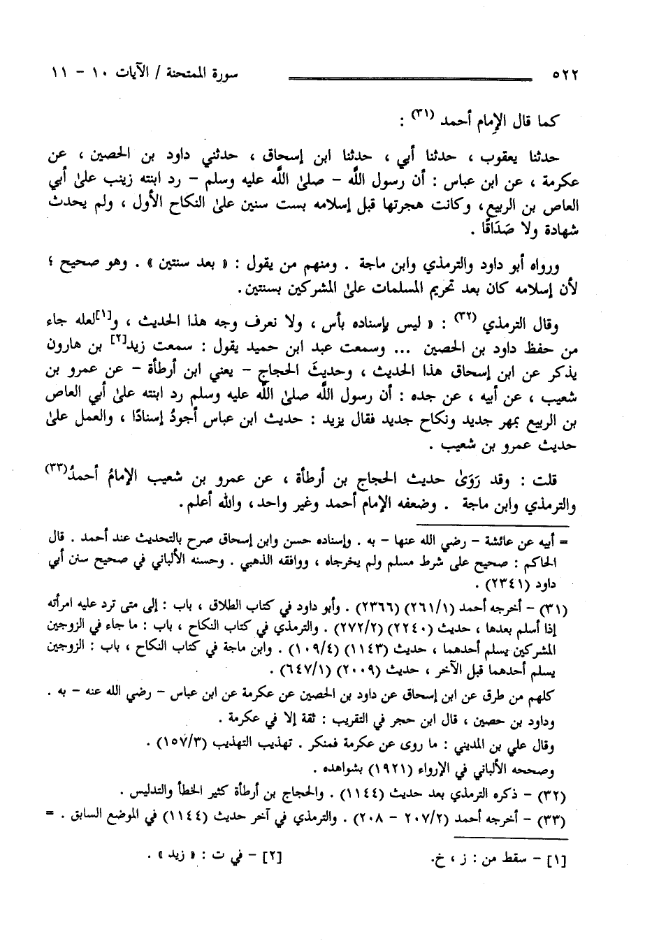 كَمَا قَالَ الْإِمَام أَحْمَد حَدَّثَنَا يَعْقُوب حَدَّثَنَا أَبِي حَدَّثَنَا اِبْن إِسْحَاق حَدَّثَنَا دَاوُد بْن الْحُصَيْن عَنْ عِكْرِمَة عَنْ اِبْن عَبَّاس أَنَّ رَسُول اللَّه صَلَّى اللَّه عَلَيْهِ وَسَلَّمَ رَدَّ اِبْنَته زَيْنَب عَلَى أَبِي الْعَاصِ وَكَانَتْ هِجْرَتهَا قَبْل إِسْلَامه بِسِتِّ سِنِينَ عَلَى النِّكَاح الْأَوَّل وَلَمْ يُحْدِث شَهَادَة وَلَا صَدَاقًا وَرَوَاهُ أَبُو دَاوُد وَالتِّرْمِذِيّ وَابْن مَاجَهْ وَمِنْهُمْ مَنْ يَقُول بَعْد سَنَتَيْنِ وَهُوَ صَحِيح لِأَنَّ إِسْلَامه كَانَ بَعْد تَحْرِيم الْمُسْلِمَات عَلَى الْمُشْرِكِينَ بِسَنَتَيْنِ وَقَالَ التِّرْمِذِيّ لَيْسَ بِإِسْنَادِهِ بَأْس وَلَا نَعْرِف وَجْه هَذَا الْحَدِيث وَلَعَلَّهُ جَاءَ مِنْ حِفْظ دَاوُد بْن الْحُصَيْن وَسَمِعْت عَبْد بْن حُمَيْد يَقُول سَمِعْت يَزِيد بْن هَارُون يَذْكُر عَنْ اِبْن إِسْحَاق هَذَا الْحَدِيث وَحَدِيث اِبْن الْحَجَّاج يَعْنِي اِبْن أَرْطَاة عَنْ عَمْرو بْن شُعَيْب عَنْ أَبِيهِ عَنْ جَدّه أَنَّ رَسُول اللَّه صَلَّى اللَّه عَلَيْهِ وَسَلَّمَ رَدَّ اِبْنَته عَلَى أَبِي الْعَاصِ بْن الرَّبِيع بِمَهْرٍ جَدِيد وَنِكَاح جَدِيد فَقَالَ يَزِيد حَدِيث اِبْن عَبَّاس أَجْوَد إِسْنَادًا وَالْعَمَل عَلَى حَدِيث عَمْرو بْن شُعَيْب ثُمَّ قُلْت وَقَدْ رَوَى حَدِيث الْحَجَّاج اِبْن أَرْطَاة عَنْ عَمْرو بْن شُعَيْب الْإِمَام أَحْمَد وَالتِّرْمِذِيّ وَابْن مَاجَهْ وَضَعَّفَهُ الْإِمَام أَحْمَد وَغَيْر وَاحِد وَاَللَّه أَعْلَم