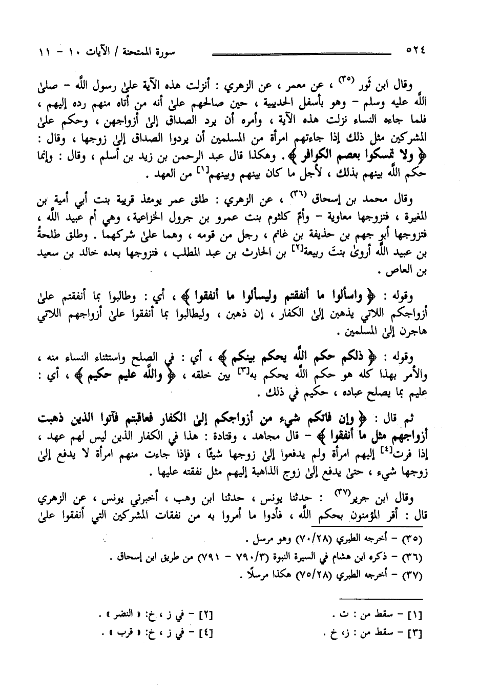 وَقَالَ اِبْن ثَوْر عَنْ مَعْمَر عَنْ الزُّهْرِيّ : أُنْزِلَتْ هَذِهِ الْآيَة عَلَى رَسُول اللَّه صَلَّى اللَّه عَلَيْهِ وَسَلَّمَ وَهُوَ بِأَسْفَل الْحُدَيْبِيَة حِين صَالَحَهُمْ عَلَى أَنَّهُ مَنْ أَتَاهُ مِنْهُمْ رَدَّهُ إِلَيْهِمْ فَلَمَّا جَاءَهُ النِّسَاء نَزَلَتْ هَذِهِ الْآيَة وَأَمَرَهُ أَنْ يَرُدّ الصَّدَاق إِلَى أَزْوَاجهنَّ وَحَكَمَ عَلَى الْمُشْرِكِينَ مِثْل ذَلِكَ إِذَا جَاءَتْهُمْ اِمْرَأَة مِنْ الْمُسْلِمِينَ أَنْ يَرُدُّوا الصَّدَاق إِلَى أَزْوَاجهنَّ وَقَالَ" وَلَا تُمْسِكُوا بِعِصَمِ الْكَوَافِر " وَهَكَذَا قَالَ عَبْد الرَّحْمَن بْن زَيْد بْن أَسْلَم وَقَالَ وَإِنَّمَا حَكَمَ اللَّه بَيْنهمْ بِذَلِكَ لِأَجْلِ مَا كَانَ بَيْنهمْ وَبَيْنهمْ مِنْ الْعَهْد وَقَالَ مُحَمَّد بْن إِسْحَاق عَنْ الزُّهْرِيّ طَلَّقَ عُمَر يَوْمئِذٍ قَرِيبَة بِنْت أَبِي أُمَيَّة بْن الْمُغِيرَة فَتَزَوَّجَهَا مُعَاوِيَة وَأُمّ كُلْثُوم بِنْت عَمْرو بْن جَرْوَل الْخُزَاعِيَّة وَهِيَ أُمّ عَبْد اللَّه فَتَزَوَّجَهَا أَبُو جَهْم بْن حُذَيْفَة بْن غَانِم رَجُل مِنْ قَوْمه وَهُمَا عَلَى شِرْكهمَا وَطَلَّقَ طَلْحَة بْن عُبَيْد اللَّه أُرْوَى بِنْت رَبِيعَة بْن الْحَارِث بْن عَبْد الْمُطَّلِب فَتَزَوَّجَهَا بَعْده خَالِد بْن سَعِيد بْن الْعَاصِ .