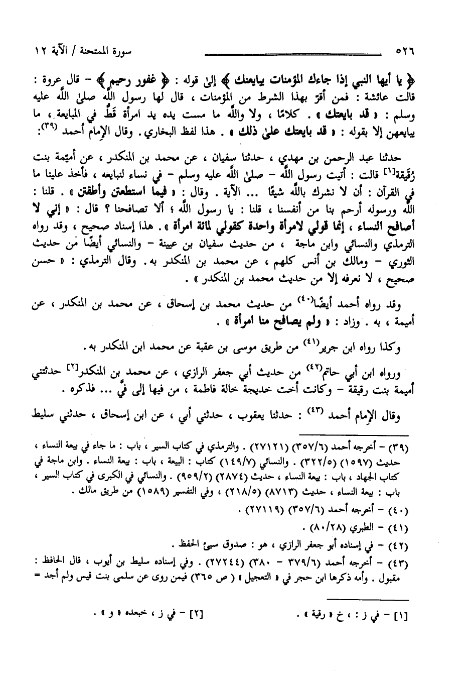 وَقَالَ الْإِمَام أَحْمَد حَدَّثَنَا عَبْد الرَّحْمَن بْن مَهْدِيّ حَدَّثَنَا سُفْيَان عَنْ مُحَمَّد بْن الْمُنْكَدِر عَنْ أُمَيْمَة بِنْت رُقَيْقَة قَالَتْ أَتَيْت رَسُول اللَّه صَلَّى اللَّه عَلَيْهِ وَسَلَّمَ فِي نِسَاء لِنُبَايِعهُ فَأَخَذَ عَلَيْنَا مَا فِي الْقُرْآن أَنْ لَا نُشْرِك بِاَللَّهِ شَيْئًا الْآيَة وَقَالَ " فِيمَا اِسْتَطَعْتُنَّ وَأَطَقْتُنَّ" قُلْنَا اللَّه وَرَسُوله أَرْحَم بِنَا مِنْ أَنْفُسنَا قُلْنَا يَا رَسُول اللَّه أَلَا تُصَافِحنَا ؟ قَالَ " إِنِّي لَا أُصَافِح النِّسَاء إِنَّمَا قَوْلِي لِامْرَأَةٍ وَاحِدَة قَوْلِي لِمِائَةِ اِمْرَأَة" هَذَا إِسْنَاد صَحِيح وَقَدْ رَوَاهُ التِّرْمِذِيّ وَالنَّسَائِيّ وَابْن مَاجَهْ مِنْ حَدِيث سُفْيَان بْن عُيَيْنَة وَالنَّسَائِيّ أَيْضًا مِنْ حَدِيث الثَّوْرِيّ وَمَالِك بْن أَنَس كُلّهمْ عَنْ مُحَمَّد بْن الْمُنْكَدِر عَنْ أُمَيْمَة بِهِ وَقَالَ التِّرْمِذِيّ حَسَن صَحِيح لَا نَعْرِفهُ إِلَّا مِنْ حَدِيث مُحَمَّد بْن الْمُنْكَدِر وَقَدْ رَوَاهُ أَحْمَد أَيْضًا مِنْ حَدِيث مُحَمَّد بْن إِسْحَاق عَنْ مُحَمَّد بْن الْمُنْكَدِر وَزَادَ : وَلَمْ يُصَافِح مِنَّا اِمْرَأَة وَكَذَا رَوَاهُ اِبْن جَرِير مِنْ طَرِيق مُوسَى بْن عُقْبَة عَنْ مُحَمَّد بْن الْمُنْكَدِر بِهِ وَرَوَاهُ اِبْن أَبِي حَاتِم مِنْ حَدِيث أَبِي جَعْفَر الرَّازِيّ عَنْ مُحَمَّد بْن الْمُنْكَدِر حَدَّثَتْنِي أُمَيْمَة بِنْت رُقَيْقَة وَكَانَتْ أُخْت خَدِيجَة خَالَة فَاطِمَة مِنْ فِيهَا إِلَى فِي فَذَكَرَهُ وَقَالَ الْإِمَام أَحْمَد حَدَّثَنَا يَعْقُوب حَدَّثَنَا أَبِي عَنْ اِبْن إِسْحَاق حَدَّثَنِي سَلِيط