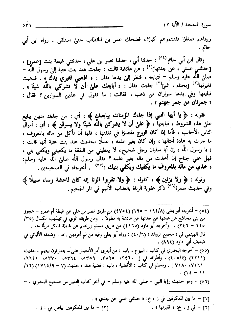 وَقَالَ اِبْن أَبِي حَاتِم حَدَّثَنَا أَبُو سَعِيد الْأَشَجّ حَدَّثَنَا اِبْن فُضَيْل عَنْ حُصَيْن عَنْ عَامِر هُوَ الشَّعْبِيّ قَالَ : بَايَعَ رَسُول اللَّه صَلَّى اللَّه عَلَيْهِ وَسَلَّمَ النِّسَاء وَفِي يَده ثَوْب قَدْ وَضَعَهُ عَلَى كَفّه ثُمَّ قَالَ " وَلَا تَقْتُلْنَ أَوْلَادكُنَّ" فَقَالَتْ اِمْرَأَة تَقْتُل آبَاءَهُمْ وَتُوصِينَا بِأَوْلَادِهِمْ ؟ قَالَ وَكَانَ بَعْد ذَلِكَ إِذَا جَاءَ النِّسَاء يُبَايِعْنَهُ جَمَعَهُنَّ فَعَرَضَ عَلَيْهِنَّ فَإِذَا أَقْرَرْنَ رَجَعْنَ فَقَوْله تَعَالَى" يَا أَيّهَا النَّبِيّ إِذَا جَاءَك الْمُؤْمِنَات يُبَايِعْنَك " أَيْ مَنْ جَاءَك مِنْهُنَّ يُبَايِع عَلَى هَذِهِ الشُّرُوط فَبَايِعْهَا عَلَى أَنْ لَا يُشْرِكْنَ بِاَللَّهِ شَيْئًا وَلَا يَسْرِقْنَ أَمْوَال النَّاس الْأَجَانِب فَأَمَّا إِذَا كَانَ الزَّوْج مُقَصِّرًا فِي نَفَقَتهَا فَلَهَا أَنْ تَأْكُل مِنْ مَاله بِالْمَعْرُوفِ مَا جَرَتْ بِهِ عَادَة أَمْثَالهَا وَإِنْ كَانَ مِنْ غَيْر عِلْمه عَمَلًا بِحَدِيثِ هِنْد بِنْت عُتْبَة أَنَّهَا قَالَتْ يَا رَسُول اللَّه إِنَّ أَبَا سُفْيَان رَجُل شَحِيح لَا يُعْطِينِي مِنْ النَّفَقَة مَا يَكْفِينِي وَيَكْفِي بَنِيَّ فَهَلْ عَلَيَّ جُنَاح إِنْ أَخَذْت مِنْ مَاله بِغَيْرِ عِلْمه ؟ فَقَالَ رَسُول اللَّه صَلَّى اللَّه عَلَيْهِ وَسَلَّمَ " خُذِي مِنْ مَاله بِالْمَعْرُوفِ مَا يَكْفِيك وَيَكْفِي بَنِيك " أَخْرَجَاهُ فِي الصَّحِيحَيْنِ وَقَوْله تَعَالَى " وَلَا يَزْنِينَ " كَقَوْلِهِ تَعَالَى" وَلَا تَقْرَبُوا الزِّنَا إِنَّهُ كَانَ فَاحِشَة وَسَاءَ سَبِيلًا" وَفِي حَدِيث سَمُرَة ذَكَرَ عُقُوبَة الزُّنَاة بِالْعَذَابِ الْأَلِيم فِي نَار الْجَحِيم