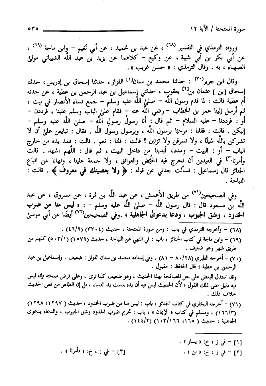 وَقَالَ اِبْن جَرِير حَدَّثَنَا مُحَمَّد بْن سِنَان الْقَزَّاز حَدَّثَنَا إِسْحَاق بْن إِدْرِيس حَدَّثَنَا إِسْحَاق بْن عُثْمَان أَبُو يَعْقُوب حَدَّثَنِي إِسْمَاعِيل بْن عَبْد الرَّحْمَن بْن عَطِيَّة عَنْ جَدَّته أُمّ عَطِيَّة قَالَتْ لَمَّا قَدِمَ رَسُول اللَّه صَلَّى اللَّه عَلَيْهِ وَسَلَّمَ جَمَعَ نِسَاء الْأَنْصَار فِي بَيْت ثُمَّ أَرْسَلَ إِلَيْنَا عُمَر بْن الْخَطَّاب رَضِيَ اللَّه عَنْهُ فَقَامَ عَلَى الْبَاب وَسَلَّمَ عَلَيْنَا فَرَدَدْنَ أَوْ فَرَدَدْنَا عَلَيْهِ السَّلَام ثُمَّ قَالَ أَنَا رَسُولُ رَسُولِ اللَّه صَلَّى اللَّه عَلَيْهِ وَسَلَّمَ إِلَيْكُنَّ قَالَتْ فَقُلْنَا مَرْحَبًا بِرَسُولِ اللَّه وَبِرَسُولِ رَسُولِ اللَّه فَقَالَ تُبَايِعْنَ عَلَى أَنْ لَا تُشْرِكْنَ بِاَللَّهِ شَيْئًا وَلَا تَسْرِقْنَ وَلَا تَزْنِينَ قَالَتْ فَقُلْنَا نَعَمْ قَالَتْ فَمَدَّ يَده مِنْ خَارِج الْبَاب أَوْ الْبَيْت وَمَدَدْنَا أَيْدِينَا مِنْ دَاخِل الْبَيْت ثُمَّ قَالَ : اللَّهُمَّ اِشْهَدْ قَالَتْ وَأَمَرَنَا فِي الْعِيدَيْنِ أَنْ نُخْرِج فِيهِ الْحُيَّض وَالْعَوَاتِق وَلَا جُمُعَة عَلَيْنَا وَنَهَانَا عَنْ اِتِّبَاع الْجَنَائِز قَالَ إِسْمَاعِيل فَسَأَلْت جَدَّتِي عَنْ قَوْله تَعَالَى " وَلَا يَعْصِينَك فِي مَعْرُوف " قَالَتْ النِّيَاحَة .