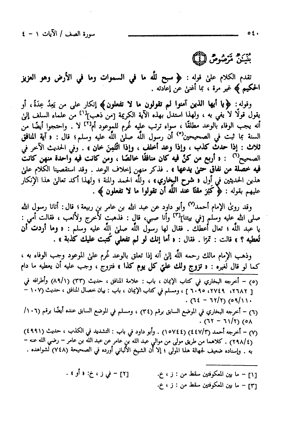 وَقَوْله تَعَالَى يَا أَيّهَا الَّذِينَ آمَنُوا لِمَ تَقُولُونَ مَا لَا تَفْعَلُونَ إِنْكَار عَلَى مَنْ يَعِدُ وَعْدًا أَوْ يَقُول قَوْلًا لَا يَفِي بِهِ وَلِهَذَا اِسْتَدَلَّ بِهَذِهِ الْآيَة الْكَرِيمَة مَنْ ذَهَبَ مِنْ عُلَمَاء السَّلَف إِلَى أَنَّهُ يَجِبُ الْوَفَاء بِالْوَعْدِ مُطْلَقًا سَوَاء تَرَتَّبَ عَلَيْهِ عَزْم الْمَوْعُود أَمْ لَا وَاحْتَجُّوا أَيْضًا مِنْ السُّنَّة بِمَا ثَبَتَ فِي الصَّحِيحَيْنِ أَنَّ رَسُول اللَّه صَلَّى اللَّه عَلَيْهِ وَسَلَّمَ قَالَ " آيَة الْمُنَافِق ثَلَاث إِذَا وَعَدَ أَخْلَفَ وَإِذَا حَدَّثَ كَذَبَ وَإِذَا اُؤْتُمِنَ خَانَ " وَفِي الْحَدِيث الْآخَر فِي الصَّحِيح " أَرْبَعٌ مَنْ كُنَّ فِيهِ كَانَ مُنَافِقًا خَالِصًا وَمَنْ كَانَتْ فِيهِ وَاحِدَة مِنْهُنَّ كَانَتْ فِيهِ خَصْلَةٌ مِنْ نِفَاق حَتَّى يَدَعَهَا " فَذَكَرَ مِنْهُنَّ إِخْلَاف الْوَعْد وَقَدْ اِسْتَقْصَيْنَا الْكَلَام عَلَى هَذَيْنِ الْحَدِيثَيْنِ فِي أَوَّل شَرْحِ الْبُخَارِيّ وَلِلَّهِ الْحَمْد وَالْمِنَّة ; وَلِهَذَا أَكَّدَ اللَّه تَعَالَى هَذَا الْإِنْكَار عَلَيْهِمْ .