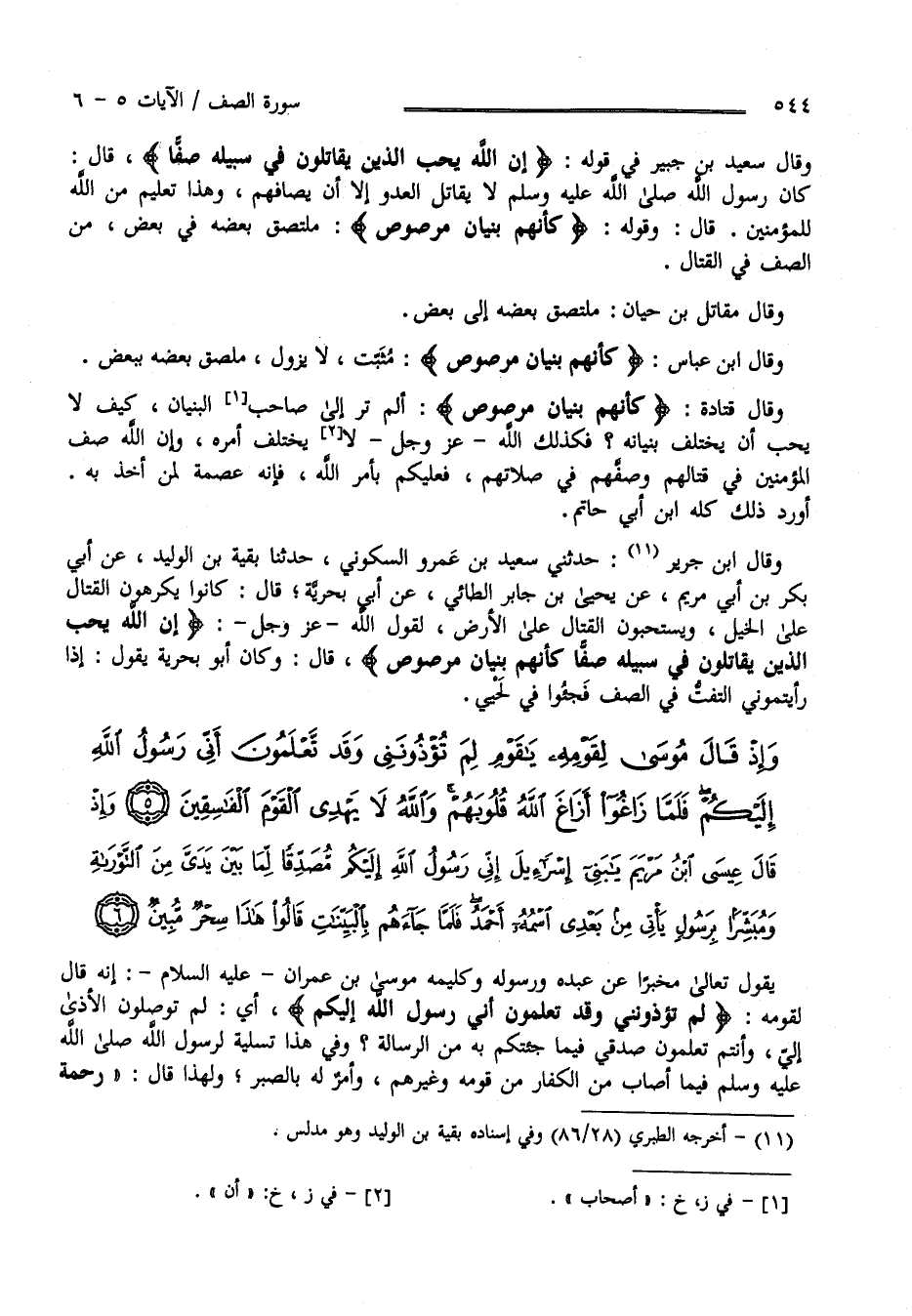 وَقَالَ سَعِيد بْن جُبَيْر فِي قَوْله تَعَالَى" إِنَّ اللَّه يُحِبّ الَّذِينَ يُقَاتِلُونَ فِي سَبِيله صَفًّا " قَالَ كَانَ رَسُول اللَّه صَلَّى اللَّه عَلَيْهِ وَسَلَّمَ لَا يُقَاتِل الْعَدُوّ إِلَّا أَنْ يُصَافّهم وَهَذَا تَعْلِيم مِنْ اللَّه لِلْمُؤْمِنِينَ قَالَ وَقَوْله تَعَالَى " كَأَنَّهُمْ بُنْيَان مَرْصُوص " أَيْ مُلْتَصِق بَعْضه بِبَعْضٍ مِنْ الصَّفّ فِي الْقِتَال وَقَالَ مُقَاتِل بْن حَيَّان مُلْتَصِق بَعْضه بِبَعْضٍ وَقَالَ اِبْن عَبَّاس كَأَنَّهُمْ بُنْيَان مَرْصُوص مُثَبَّت لَا يَزُول مُلْصَق بَعْضه بِبَعْضٍ .