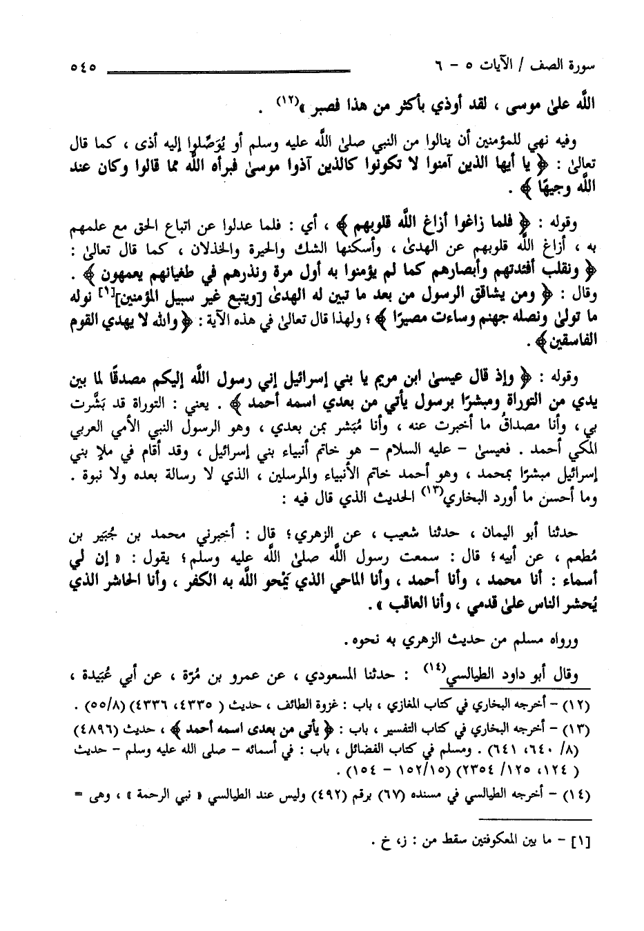 وَقَوْله تَعَالَى وَإِذْ قَالَ عِيسَى اِبْن مَرْيَم يَا بَنِي إِسْرَائِيل إِنِّي رَسُول اللَّه إِلَيْكُمْ مُصَدِّقًا لِمَا بَيْن يَدَيَّ مِنْ التَّوْرَاة وَمُبَشِّرًا بِرَسُولٍ يَأْتِي مِنْ بَعْدِي اِسْمه أَحْمَد يَعْنِي التَّوْرَاة قَدْ بَشَّرَتْ بِي وَأَنَا مُصَدِّق مَا أَخْبَرَتْ عَنْهُ وَأَنَا مُبَشِّر بِمَنْ بَعْدِي وَهُوَ الرَّسُول النَّبِيّ الْأُمِّيّ الْعَرَبِيّ الْمَكِّيّ أَحْمَد فَعِيسَى عَلَيْهِ السَّلَام وَهُوَ خَاتَم أَنْبِيَاء بَنِي إِسْرَائِيل وَقَدْ قَامَ فِي مَلَإِ بَنِي إِسْرَائِيل مُبَشِّرًا بِمُحَمَّدٍ وَهُوَ أَحْمَد خَاتَم الْأَنْبِيَاء وَالْمُرْسَلِينَ الَّذِي لَا رِسَالَة بَعْده وَلَا نُبُوَّة وَمَا أَحْسَن مَا أَوْرَدَ الْبُخَارِيّ الَّذِي قَالَ فِيهِ حَدَّثَنَا أَبُو الْيَمَان حَدَّثَنَا شُعَيْب عَنْ الزُّهْرِيّ قَالَ أَخْبَرَنِي مُحَمَّد بْن جُبَيْر بْن مُطْعِم عَنْ أَبِيهِ قَالَ سَمِعْت رَسُول اللَّه صَلَّى اللَّه عَلَيْهِ وَسَلَّمَ يَقُول " إِنَّ لِي أَسْمَاء أَنَا مُحَمَّد وَأَنَا أَحْمَد وَأَنَا الْمَاحِي الَّذِي يَمْحُو اللَّه بِهِ الْكُفْر وَأَنَا الْحَاشِر الَّذِي يُحْشَر النَّاس عَلَى قَدَمِي وَأَنَا الْعَاقِب" وَرَوَاهُ مُسْلِم مِنْ حَدِيث الزُّهْرِيّ بِهِ نَحْوه .