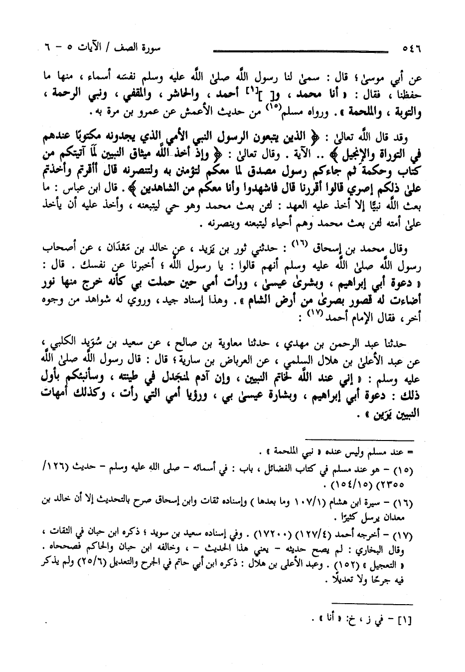 عَنْ أَبِي مُوسَى قَالَ سَمَّى لَنَا رَسُول اللَّه صَلَّى اللَّه عَلَيْهِ وَسَلَّمَ نَفْسه أَسْمَاء مِنْهَا مَا حَفِظْنَا فَقَالَ " أَنَا مُحَمَّد وَأَنَا أَحْمَد وَالْحَاشِر وَالْمُقَفِّي وَنَبِيّ الرَّحْمَة وَالتَّوْبَة وَالْمَلْحَمَة " وَرَوَاهُ مُسْلِم مِنْ حَدِيث الْأَعْمَش عَنْ عَمْرو بْن مُرَّة بِهِ وَقَدْ قَالَ اللَّه تَعَالَى الَّذِينَ يَتَّبِعُونَ الرَّسُول النَّبِيّ الْأُمِّيّ الَّذِي يَجِدُونَهُ مَكْتُوبًا عِنْدهمْ فِي التَّوْرَاة وَالْإِنْجِيل الْآيَة وَقَالَ تَعَالَى " وَإِذْ أَخَذَ اللَّه مِيثَاق النَّبِيِّينَ لَمَا آتَيْتُكُمْ مِنْ كِتَاب وَحِكْمَة ثُمَّ جَاءَكُمْ رَسُول مُصَدِّق لِمَا مَعَكُمْ لَتُؤْمِنُنَّ بِهِ وَلْتَنْصُرُنَّهُ قَالَ أَأَقْرَرْتُمْ وَأَخَذْتُمْ عَلَى ذَلِكُمْ إِصْرِي قَالُوا أَقْرَرْنَا قَالَ فَاشْهَدُوا وَأَنَا مَعَكُمْ مِنْ الشَّاهِدِينَ " قَالَ اِبْن عَبَّاس : مَا بَعَثَ اللَّه نَبِيًّا إِلَّا أَخَذَ عَلَيْهِ الْعَهْد لَئِنْ بُعِثَ مُحَمَّد وَهُوَ حَيّ لَيَتَّبِعَنهُ وَأَخَذَ عَلَيْهِ أَنْ يَأْخُذ عَلَى أُمَّته لَئِنْ بُعِثَ مُحَمَّد وَهُمْ أَحْيَاء لَيَتَّبِعُنَّهُ وَيَنْصُرُنَّهُ وَقَالَ مُحَمَّد بْن إِسْحَاق حَدَّثَنِي ثَوْر بْن يَزِيد عَنْ خَالِد بْن مَعْدَان عَنْ أَصْحَاب رَسُول اللَّه صَلَّى اللَّه عَلَيْهِ وَسَلَّمَ أَنَّهُمْ قَالُوا يَا رَسُول اللَّه أَخْبِرْنَا عَنْ نَفْسك قَالَ" دَعْوَة أَبِي إِبْرَاهِيم وَبُشْرَى عِيسَى وَرَأَتْ أُمِّي حِين حَمَلَتْ بِي كَأَنَّهُ خَرَجَ مِنْهَا نُور أَضَاءَتْ لَهُ قُصُور بُصْرَى مِنْ أَرْض الشَّام " وَهَذَا إِسْنَاد جَيِّد وَرُوِيَ لَهُ شَوَاهِد مِنْ وُجُوه أُخَر فَقَالَ الْإِمَام أَحْمَد حَدَّثَنَا عَبْد الرَّحْمَن بْن مَهْدِيّ حَدَّثَنَا مُعَاوِيَة بْن صَالِح عَنْ سَعِيد بْن سُوَيْد الْكَلْبِيّ عَنْ عَبْد الْأَعْلَى بْن هِلَال السُّلَمِيّ عَنْ الْعِرْبَاض بْن سَارِيَة قَالَ : قَالَ رَسُول اللَّه صَلَّى اللَّه عَلَيْهِ وَسَلَّمَ" إِنِّي عِنْد اللَّه لَخَاتَم النَّبِيِّينَ وَإِنَّ آدَم لَمُنْجَدِل فِي طِينَته وَسَأُنَبِّئُكُمْ بِأَوَّلِ ذَلِكَ دَعْوَة أَبِي إِبْرَاهِيم وَبِشَارَة عِيسَى بِي وَرُؤْيَا أُمِّي الَّتِي رَأَتْ وَكَذَلِكَ أُمَّهَات النَّبِيِّينَ يَرَيْنَ