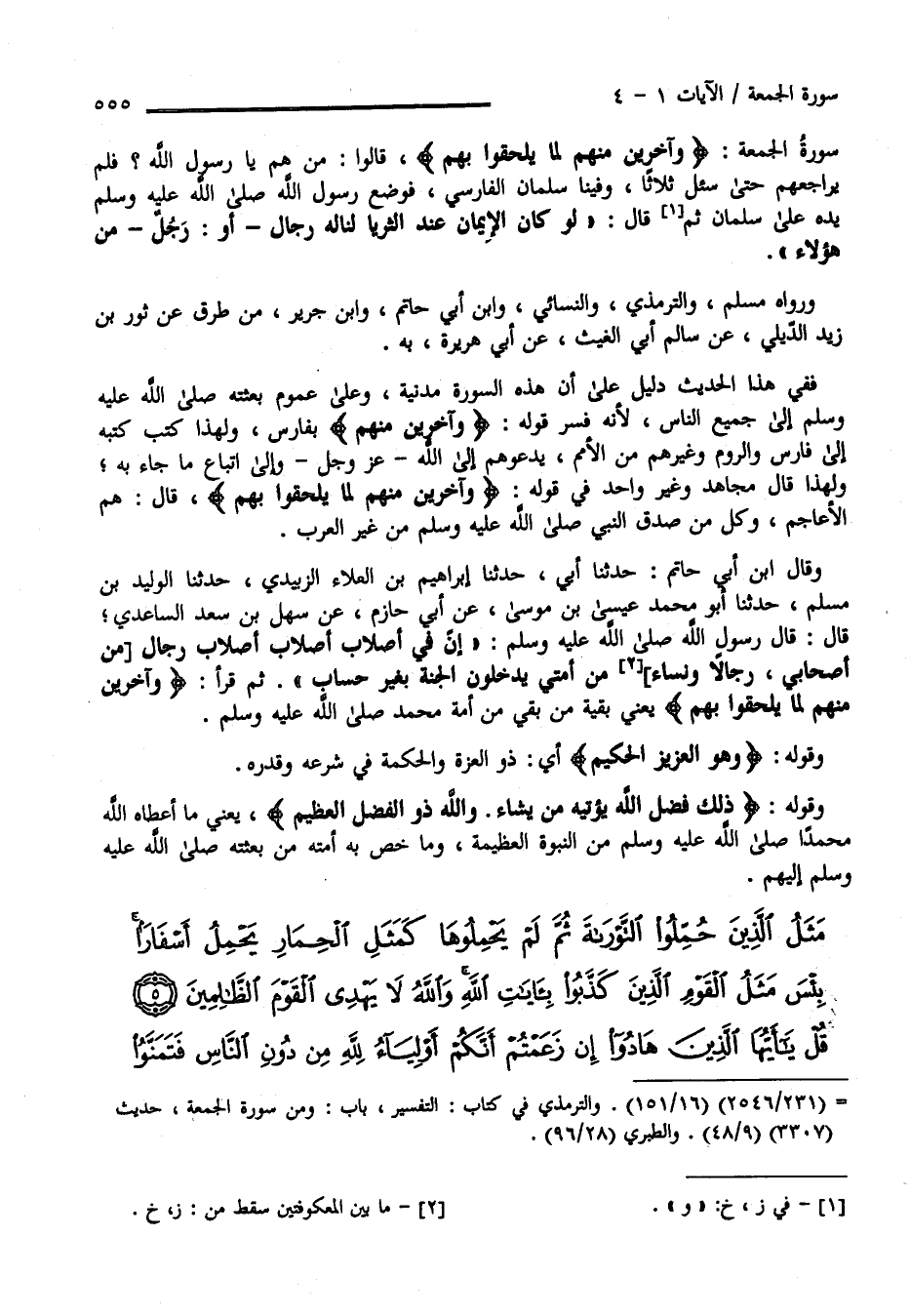 سُورَة الْجُمُعَة " وَآخَرِينَ مِنْهُمْ لَمَّا يَلْحَقُوا بِهِمْ " قَالُوا مَنْ هُمْ يَا رَسُول اللَّه ؟ فَلَمْ يُرَاجِعْهُمْ حَتَّى سُئِلَ ثَلَاثًا وَفِينَا سَلْمَان الْفَارِسِيّ فَوَضَعَ رَسُول اللَّه صَلَّى اللَّه عَلَيْهِ وَسَلَّمَ يَده عَلَى سَلْمَان الْفَارِسِيّ ثُمَّ قَالَ " لَوْ كَانَ الْإِيمَان عِنْد الثُّرَيَّا لَنَالَهُ رِجَال أَوْ رَجُل مِنْ هَؤُلَاءِ " وَرَوَاهُ مُسْلِم وَالتِّرْمِذِيّ وَالنَّسَائِيّ وَابْن أَبِي حَاتِم وَابْن جَرِير مِنْ طُرُق عَنْ ثَوْر بْن يَزِيد الدَّيْلِيّ عَنْ سَالِم أَبِي الْغَيْث عَنْ أَبِي هُرَيْرَة بِهِ فَفِي هَذَا الْحَدِيث دَلِيل عَلَى أَنَّ هَذِهِ السُّورَة مَدَنِيَّة وَعَلَى عُمُوم بَعْثَته صَلَّى اللَّه عَلَيْهِ وَسَلَّمَ إِلَى جَمِيع النَّاس لِأَنَّهُ فَسَّرَ قَوْله تَعَالَى " وَآخَرِينَ مِنْهُمْ " بِفَارِسَ.