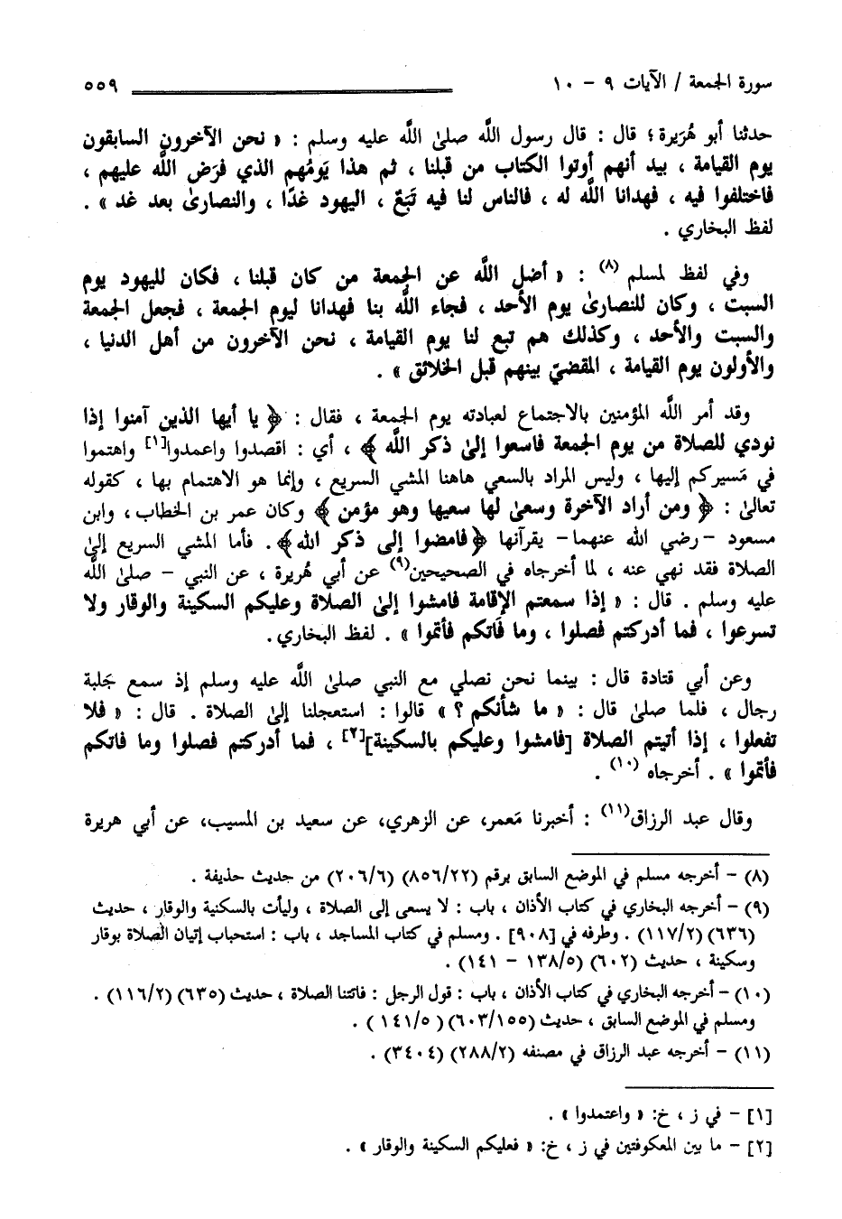 حَدَّثَنَا أَبُو هُرَيْرَة قَالَ : قَالَ رَسُول اللَّه صَلَّى اللَّه عَلَيْهِ وَسَلَّمَ " نَحْنُ الْآخِرُونَ السَّابِقُونَ يَوْم الْقِيَامَة بَيْد أَنَّهُمْ أُوتُوا الْكِتَاب مِنْ قَبْلنَا ثُمَّ إِنَّ هَذَا يَوْمهمْ الَّذِي فَرَضَ اللَّه عَلَيْهِمْ فَاخْتَلَفُوا فِيهِ فَهَدَانَا اللَّه لَهُ فَالنَّاس لَنَا فِيهِ تَبَعُ الْيَهُود غَدًا وَالنَّصَارَى بَعْد غَد " لَفْظ الْبُخَارِيّ وَفِي لَفْظ لِمُسْلِمٍ" أَضَلَّ اللَّه عَنْ الْجُمُعَة مَنْ كَانَ قَبْلنَا فَكَانَ لِلْيَهُودِ يَوْم السَّبْت وَكَانَ لِلنَّصَارَى يَوْم الْأَحَد فَجَاءَ اللَّه بِنَا فَهَدَانَا اللَّه لِيَوْمِ الْجُمُعَة فَجَعَلَ الْجُمُعَة وَالسَّبْت وَالْأَحَد وَكَذَلِكَ هُمْ تَبَع لَنَا يَوْم الْقِيَامَة نَحْنُ الْآخِرُونَ مِنْ أَهْل الدُّنْيَا وَالْأَوَّلُونَ يَوْم الْقِيَامَة الْمَقْضِيّ بَيْنَهُمْ قَبْل الْخَلَائِق " وَقَدْ أَمَرَ اللَّه الْمُؤْمِنِينَ بِالِاجْتِمَاعِ لِعِبَادَتِهِ يَوْم الْجُمُعَة فَقَالَ تَعَالَى " يَا أَيّهَا الَّذِينَ آمَنُوا إِذَا نُودِيَ لِلصَّلَاةِ مِنْ يَوْم الْجُمُعَة فَاسْعَوْا إِلَى ذِكْرِ اللَّه " أَيْ اقْصُدُوا وَاعْمِدُوا وَاهْتَمُّوا فِي سَيْرِكُمْ إِلَيْهَا وَلَيْسَ الْمُرَاد بِالسَّعْيِ هَاهُنَا الْمَشْي السَّرِيع وَإِنَّمَا هُوَ الِاهْتِمَام بِهَا كَقَوْلِهِ تَعَالَى " وَمَنْ أَرَادَ الْآخِرَة وَسَعَى لَهَا سَعْيهَا وَهُوَ مُؤْمِن " وَكَانَ عُمَر بْن الْخَطَّاب وَابْن مَسْعُود رَضِيَ اللَّه عَنْهُمَا يَقْرَآنِهَا " فَامْضُوا إِلَى ذِكْر اللَّه " فَأَمَّا الْمَشْي السَّرِيع إِلَى الصَّلَاة فَقَدْ نُهِيَ عَنْهُ لِمَا أَخْرَجَاهُ فِي الصَّحِيحَيْنِ عَنْ أَبِي هُرَيْرَة عَنْ النَّبِيّ صَلَّى اللَّه عَلَيْهِ وَسَلَّمَ قَالَ " إِذَا سَمِعْتُمْ الْإِقَامَة فَامْشُوا إِلَى الصَّلَاة وَعَلَيْكُمْ السَّكِينَة وَالْوَقَار وَلَا تُسْرِعُوا فَمَا أَدْرَكْتُمْ فَصَلُّوا وَمَا فَاتَكُمْ فَأَتِمُّوا " لَفْظ الْبُخَارِيّ وَعَنْ أَبِي قَتَادَة قَالَ : بَيْنَمَا نَحْنُ نُصَلِّي مَعَ النَّبِيّ صَلَّى اللَّه عَلَيْهِ وَسَلَّمَ إِذْ سَمِعَ جَلَبَة رِجَال فَلَمَّا صَلَّى قَالَ " مَا شَأْنكُمْ " قَالُوا اِسْتَعْجَلْنَا إِلَى الصَّلَاة قَالَ" فَلَا