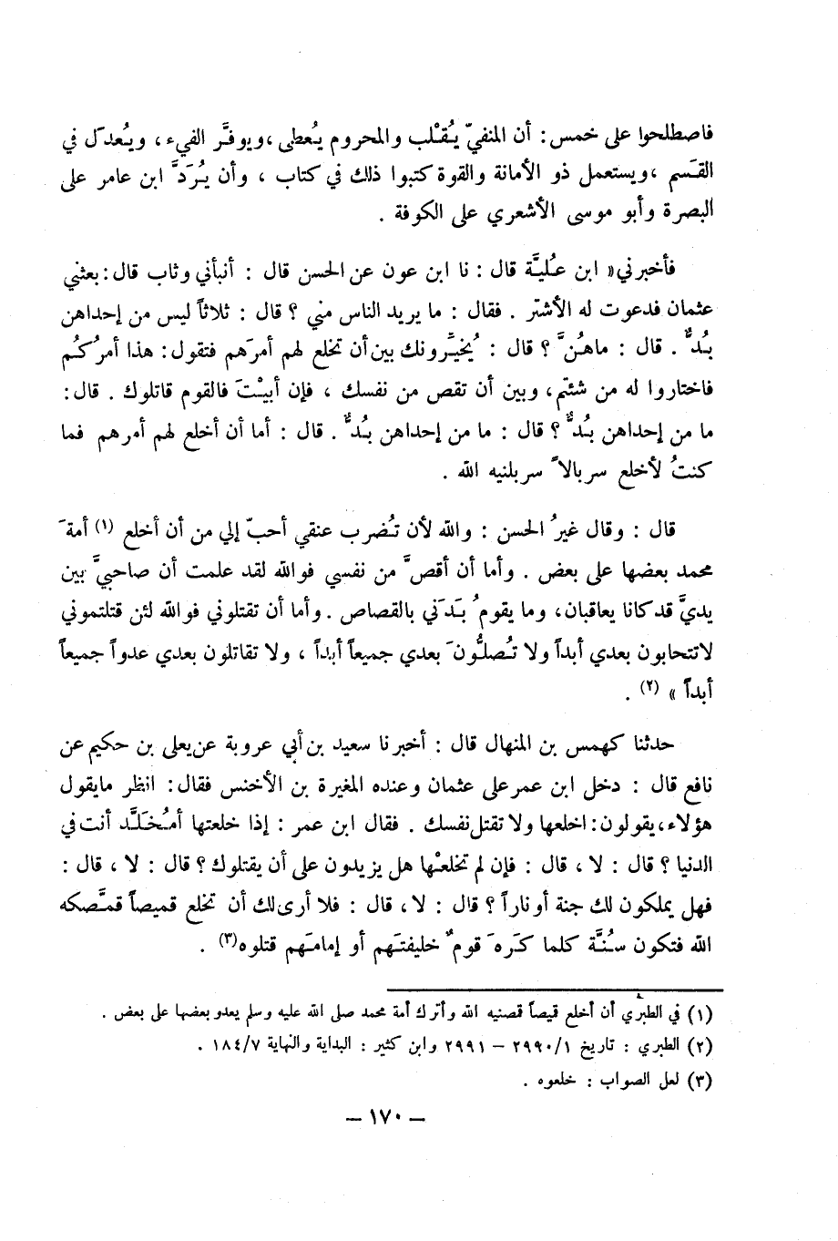 فَأَخْبرنِي ابْن علية قَالَ نَا ابْن عون عَن الْحسن قَالَ أنبأني وثاب قَالَ بَعَثَنِي عُثْمَان فدعوت لَهُ الأشتر فَقَالَ مَا يُرِيد النَّاس مني قَالَ ثَلَاثًا لَيْسَ من إِحْدَاهُنَّ بُد قَالَ مَا هن قَالَ يخيرونك بَين أَن تخلع لَهُم أَمرهم فَتَقول هَذَا أَمركُم فَاخْتَارُوا لَهُ من شِئْتُم وَبَين أَن تقص من نَفسك فَإِن أَبيت فالقوم قاتلوك قَالَ مَا من إِحْدَاهُنَّ بُد قَالَ مَا من إِحْدَاهُنَّ بُد قَالَ أما أَن أَخْلَع لَهُم أَمرهم فَمَا كنت لأخلع سربالا سربلنيه اللَّه