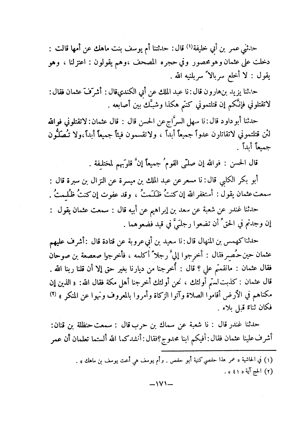 حَدَّثَنَا أَبُو دَاوُد قَالَ نَا سهل السراج عَن الْحسن قَالَ قَالَ عُثْمَان لَا تقتلوني فوَاللَّه لَئِن قتلتموني لَا تقاتلون عدوا جَمِيعًا أبدا وَلَا تقسمون فَيْئا جَمِيعًا أبدا وَلَا تصلونَ جَمِيعًا أبدا قَالَ الْحسن فوَاللَّه إِن صلى الله الْقَوْم جَمِيعًا إِن قُلُوبهم لمختلفة أَبُو بَكْر الْكَلْبِيّ قَالَ نَا مسعر عَن عَبْد الْملك بْن ميسرَة عَن النزال بْن سُبْرَة قَالَ سَمِعت عُثْمَان يَقُول أسْتَغْفر اللَّه إِن كنت ظلمت وَقد عَفَوْت إِن كنت ظلمت حَدَّثَنَا غنْدر عَن شُعْبَة عَن سعد بْن إِبْرَاهِيم عَن أَبِيه قَالَ سَمِعت عُثْمَان يَقُول إِن وجدْتُم فِي الْحق أَن تضعوا رجْلي فِي قيد فضعوهما حَدَّثَنَا كهمس بْن الْمنْهَال قَالَ نَا سعيد بْن أَبِي عرُوبَة عَن قَتَادَة قَالَ أشرف عَلَيْهِم عُثْمَان حِين حصر فَقَالَ أخرجُوا إِلَيّ رجلا ُأكَلِّمهُ فأخرجوا صعصعة بْن صوحان فَقَالَ عُثْمَان مَا نقمتم عَلِيّ قَالَ أخرجنَا من دِيَارنَا بِغَيْر حق إِلَّا أَن قُلْنَا رَبنَا اللَّه قَالَ عُثْمَان كذبت لَسْتُم أُولَئِكَ نَحن أُولَئِكَ أخرجنَا أهل مَكَّة فَقَالَ اللَّه الَّذِينَ إِنْ مَكَّنَّاهُمْ فِي الأَرْضِ أَقَامُوا الصَّلاةَ وَآتَوُا الزَّكَاةَ وَأَمَرُوا بِالْمَعْرُوفِ وَنَهَوْا عَن الْمُنكر فَكَانَ ثَنَاء قبل بلَاء حَدَّثَنَا غنْدر قَالَ نَا شُعْبَة عَن سماك بْن حَرْب قَالَ سَمِعت حَنْظَلَة بْن قنان أشرف علينا عُثْمَان فَقَالَ أفيكم ابْنا محدوج فَقَالَ أنْشد كَمَا اللَّه ألستما تعلمان أَن عمر