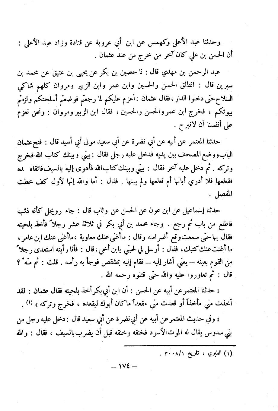 وَحَدَّثَنَا عَبْد الْأَعْلَى وكهمس عَن ابْن عرُوبَة عَن قَتَادَة وَزَاد عَبْد الْأَعْلَى أَن الْحسن بْن عَلِيّ كَانَ آخر من خرج من عَند عُثْمَان عَبْد الرَّحْمَن بْن مهْدي قَالَ نَا حُصَيْن بْن بَكْر عَن يحيى بْن عَتيق عَن مُحَمَّد بْن سِيرِين قَالَ انْطلق الْحسن وَالْحُسَيْن وَابْن عُمَر وَابْن الزبير ومروان كلهم شاكي السِّلَاح حَتَّى دخلُوا الدَّار فَقَالَ عُثْمَان أعزم عَلَيْكُم لما رجعتم فوضعتم أسلحتكم ولزمتم بُيُوتكُمْ فَخرج ابْن عمر وَالْحسن وَالْحُسَيْن فَقَالَ ابْن الزبير ومروان وَنحن نعزم على أَنْفُسنَا أَن لَا نَبْرَح حَدَّثَنَا الْمُعْتَمِر عَن أَبِيه عَن أَبِي نَضرة عَن أَبِي سعيد مولى أَبِي أسيد قَالَ فتح عُثْمَان الْبَاب وَوضع الْمُصحف بَين يَدَيْهِ فَدخل عَلَيْهِ رجل فَقَالَ بيني وَبَيْنك كتاب اللَّه فَخرج وَتَركه ثمَّ دخل عَلَيْهِ آخر فَقَالَ بيني وَبَيْنك كتاب اللَّه فَأَهوى إِلَيْهِ بِالسَّيْفِ فاتقاه فقطعها فَلَا أَدْرِي أَبَانهَا أم قطعهَا وَلم يبنها فَقَالَ أما وَالله إِنَّهَا لأوّل كف خطت الْمفصل