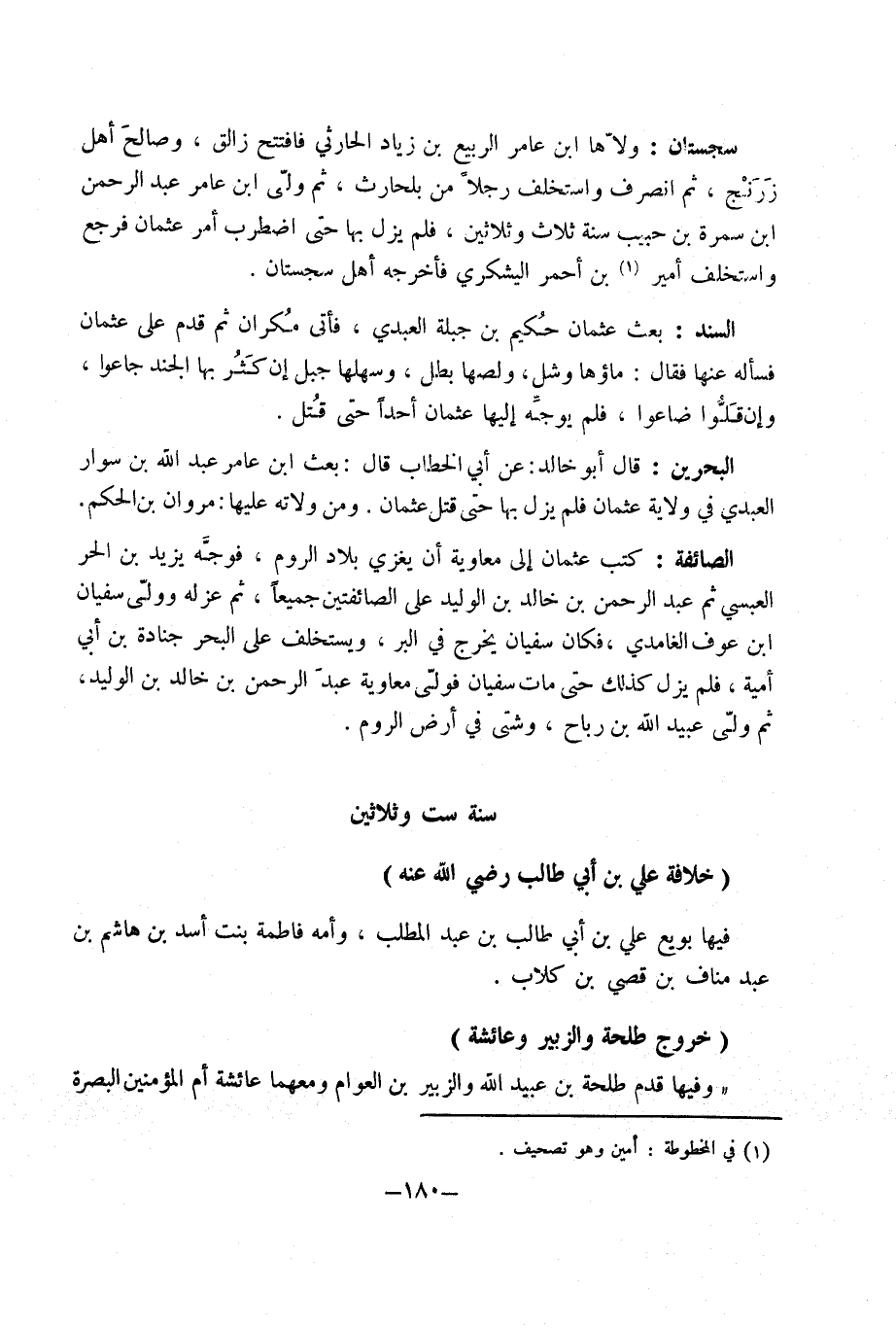 سجستان ولاها ابْن عَامر الرّبيع بْن زِيَاد الْحَارِثِيّ فَافْتتحَ زالق وَصَالح أهل زرنج ثمَّ انْصَرف واستخلف رجلا من بلحارث ثمَّ ولى ابْن عَامر عَبْد الرَّحْمَن ابْن سَمُرَة بْن حبيب سنة ثَلَاث وَثَلَاثِينَ فَلم يزل بهَا حَتَّى اضْطربَ أَمر عُثْمَان فَرجع واستخلف أَمِير بْن أَحْمَر الْيَشْكُرِي فَأخْرجهُ أهل سجستان السَّنَد بعث عُثْمَان حَكِيم بْن جبلة الْعَبْدي فَأتى مكران ثمَّ قدم عَلَى عُثْمَان فَسَأَلَهُ عَنها فَقَالَ مَاؤُهَا وشل ولصها بَطل وسهلها جبل إِن كثر بهَا الْجند جَاعُوا وَإِن قلوا ضَاعُوا فَلم يُوَجه إِلَيْهَا عُثْمَان أحدا حَتَّى قتل الْبَحْرين قَالَ أَبُو خَالِد عَن أَبِي الْخطاب قَالَ بعث ابْن عَامر عَبْد اللَّهِ بْن سوار الْعَبْدي فِي ولَايَة عُثْمَان فَلم يزل بهَا حَتَّى قتل عُثْمَان وَمن ولاته عَلَيْهَا مَرْوَان بْن الحكم الصائفة كتب عُثْمَان إِلَى مُعَاوِيَة أَن يغزي بِلَاد الرّوم فَوجه يَزِيد بْن الْحر الْعَبْسِي ثمَّ عَبْد الرَّحْمَن بْن خَالِد بْن الْوَلِيد عَلَى الصائفتين جَمِيعًا ثمَّ عَزله وَولى سُفْيَان ابْن عَوْف الغامدي فَكَانَ سُفْيَان يخرج فِي الْبر ويستخلف عَلَى الْبَحْر جُنَادَة بْن أَبِي أُميَّة فَلم يزل كَذَلِكَ حَتَّى مَاتَ سُفْيَان فولى مُعَاوِيَة عَبْد الرَّحْمَن بْن خَالِد بْن الْوَلِيد ثمَّ ولى عبيد اللَّه بْن رَبَاح وشتى فِي أَرض الرّوم