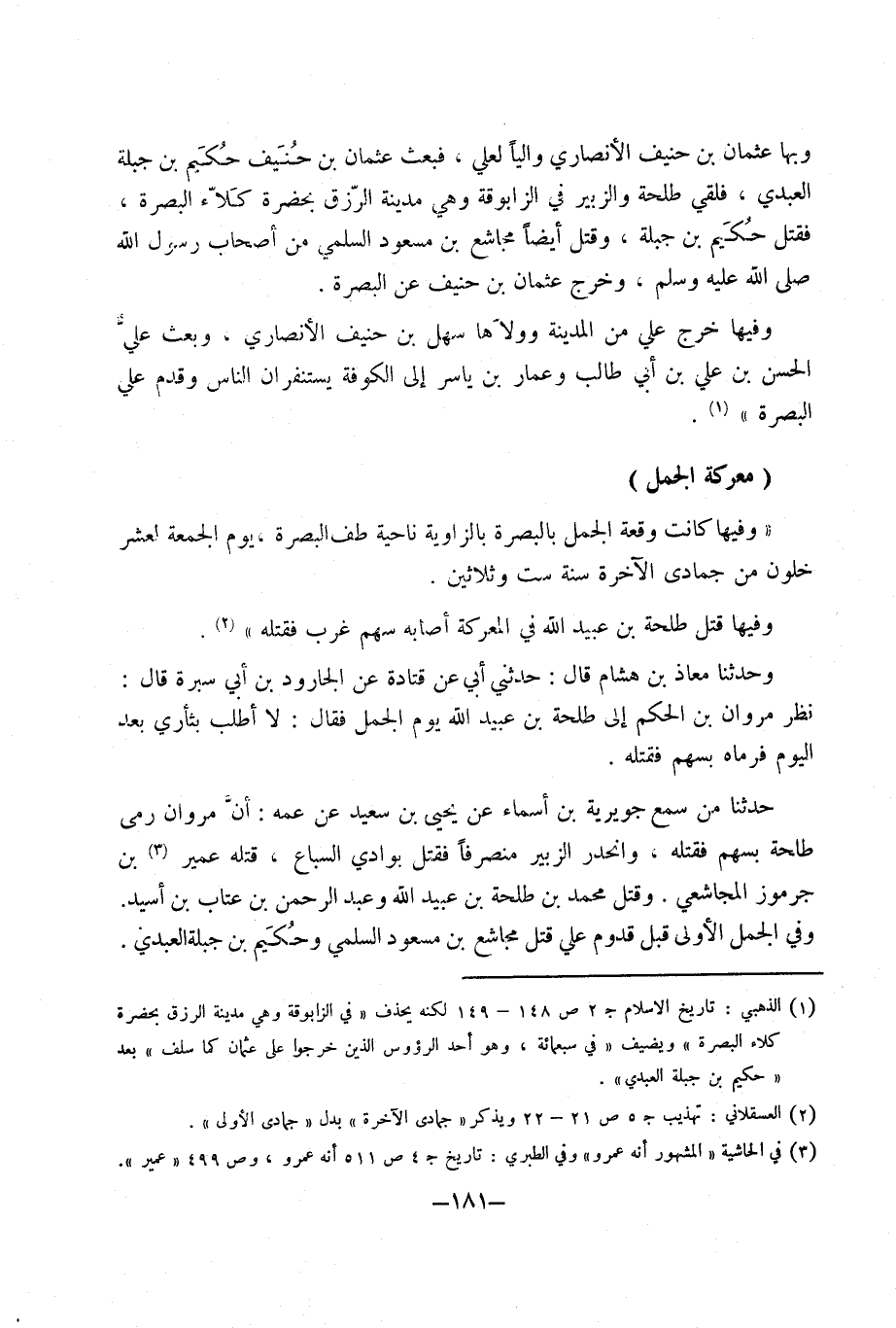 وفيهَا قتل طَلْحَة بْن عبيد اللَّه فِي المعركة أَصَابَهُ سهم غرب فَقتله وَحَدَّثَنَا معَاذ بْن هِشَام قَالَ حَدَّثَنِي أَبِي عَنْ قَتَادَةَ عَن الْجَارُود بْن أَبِي سيرة قَالَ نظر مَرْوَان بْن الحكم إِلَى طَلْحَة بْن عبيد اللَّه يَوْم الْجمل فَقَالَ لَا أطلب بِثَأْرِي بعد الْيَوْم فَرَمَاهُ بِسَهْم فَقتله