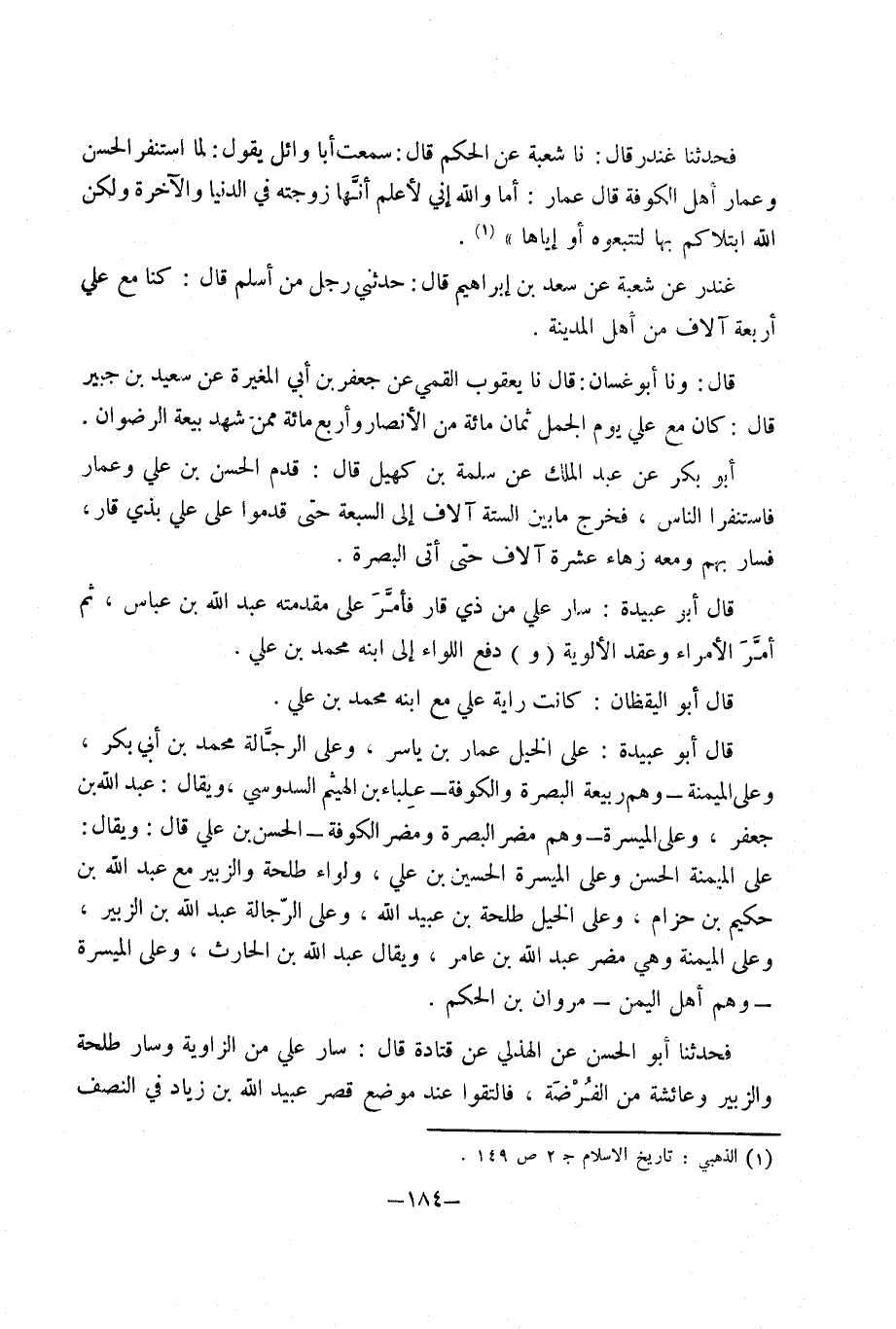 فحدثنا غنْدر قَالَ نَا شُعْبَة عَن الحكم قَالَ سَمِعت أَبَا وَائِل يَقُول لما اسْتنْفرَ الْحسن وعمار أهل الْكُوفَة قَالَ عمار أما وَالله إِنِّي لأعْلم أَنَّهَا زَوجته فِي الدُّنْيَا وَالْآخِرَة وَلَكِن اللَّه ابتلاكم بهَا لتتبعوه أَو إِيَّاهَا غنْدر عَن شُعْبَة عَن سعد بْن إِبْرَاهِيم قَالَ حَدَّثَنِي رجل من أسلم قَالَ كُنَّا مَعَ عَلِيّ أَرْبَعَة آلَاف من اهل الْمَدِينَة قَالَ ونا أَبُو غَسَّان قَالَ نَا يَعْقُوب القمي عَن جَعْفَر أَبِي الْمُغيرَة عَن سعيد بْن جُبَير قَالَ كَانَ مَعَ عَلِيّ يَوْم الْجمل ثَمَان مائَة من الْأَنْصَار وَأَرْبع مائَة مِمَّن شهد بيعَة الرضْوَان أَبُو بَكْر عَن عَبْد الْملك عَن سَلمَة بْن كهيل قَالَ قدم الْحسن بْن عَلِيّ وعمار فاستنفرا النَّاس فَخرج مَا بَين السِّتَّة آلَاف إِلَى السَّبْعَة حَتَّى قدمُوا عَلَى عَلِيّ بِذِي قار فَسَار بهم وَمَعَهُ زهاء عشرَة آلَاف حَتَّى أَتَى الْبَصْرَة قَالَ أَبُو عُبَيْدَة سَار عَلِيّ من ذِي قار فَأمر عَلَى مقدمته عَبْد اللَّهِ بْن عَبَّاس ثمَّ أَمر الْأُمَرَاء وَعقد الألوية ودفع اللِّوَاء إِلَى ابْنه مُحَمَّد بْن عَلِيّ قَالَ أَبُو الْيَقظَان كَانَت راية عَلِيّ مَعَ ابْنه مُحَمَّد بْن عَلِيّ قَالَ أَبُو عُبَيْدَة عَلَى الْخَيل عمار بْن يَاسر وعَلى الرجالة مُحَمَّد بْن أَبِي بَكْر وعَلى الميمنة وهم ربيعَة الْبَصْرَة والكوفة علْبَاء بْن الْهَيْثَم السدُوسِي وَيُقَال عَبْد اللَّهِ بْن جَعْفَر وعَلى الميسرة وهم مُضر الْبَصْرَة وَمُضر الْكُوفَة الْحسن بْن عَلِيّ قَالَ وَيُقَال عَلَى الميمنة الْحسن وعَلى المسيرة الْحُسَيْن بْن عَلِيّ ولواء طَلْحَة وَالزُّبَيْر مَعَ عَبْد اللَّهِ بْن حَكِيم بْن حزَام وعَلى الْخَيل طَلْحَة بْن عبيد اللَّه وعَلى الرجالة عَبْد اللَّهِ بْن الزبير وعَلى الميمنة وَهِي مُضر عَبْد اللَّهِ بْن عَامر وَيُقَال عَبْد اللَّهِ بْن الْحَارِث وعَلى الميسرة وهم أهل الْيمن مَرْوَان بْن الحكم فحدثنا أَبُو الْحسن عَن الْهُذلِيّ عَن قَتَادَة قَالَ سَار عَلِيّ من الزاوية وَسَار طَلْحَة وَالزُّبَيْر وَعَائِشَة من الفرضة فَالْتَقوا عَند مَوضِع قصر عبيد اللَّه بْن زِيَاد فِي النّصْف