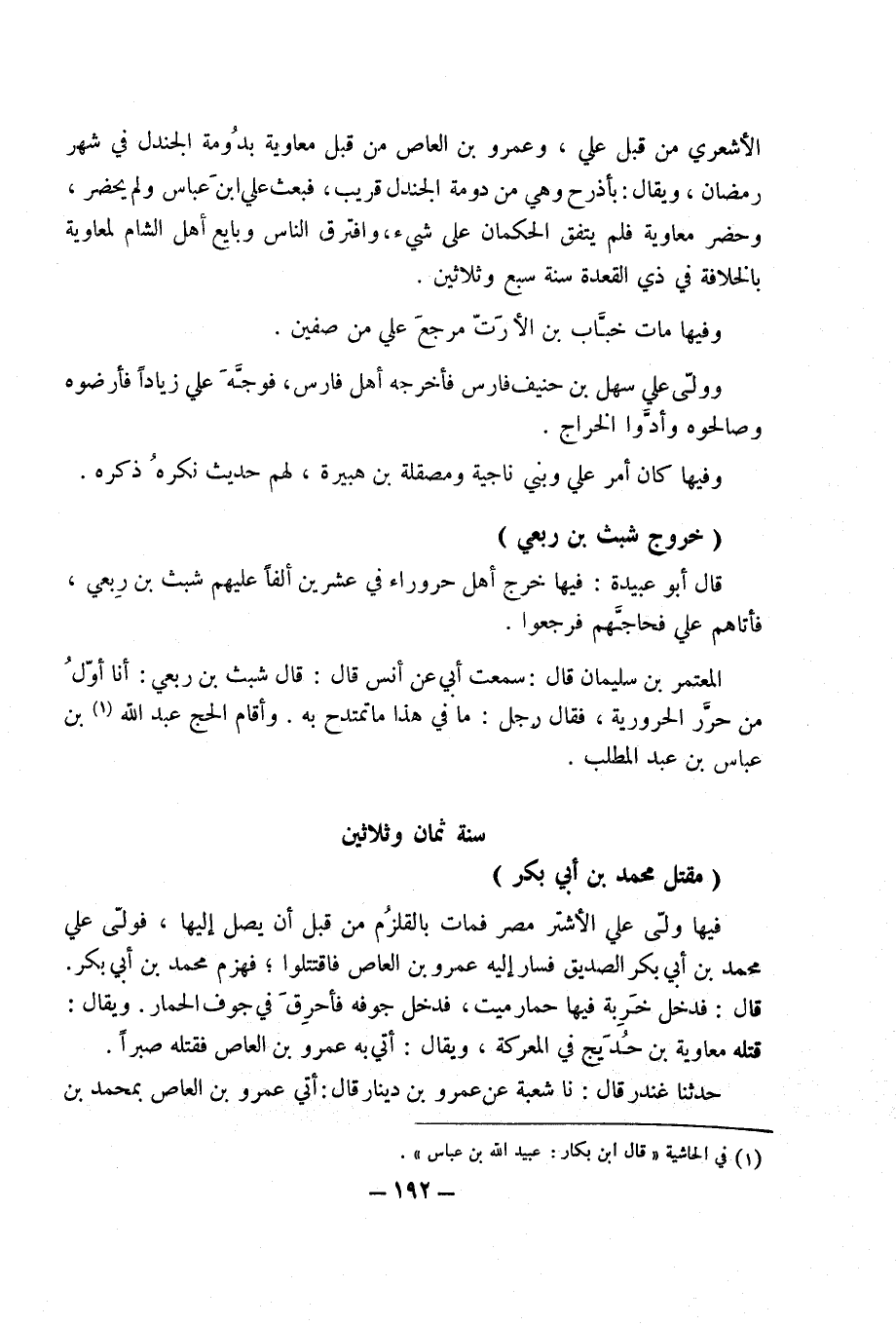 خُرُوج شبث بن ربعي قَالَ أَبُو عُبَيْدَة فِيهَا خرج أهل حروراء فِي عشْرين ألفا عَلَيْهِم شبث بْن ربعي فَأَتَاهُم عَلِيّ فحاجهم فَرَجَعُوا الْمُعْتَمِر بْن سُلَيْمَان قَالَ سَمِعت أَبِي عَن أنس قَالَ قَالَ شبث بْن ربعي أَنا أول من حرر الحرورية فَقَالَ رجل مَا فِي هَذَا مَا تمتدح بِهِ وَأقَام الْحَج عَبْد اللَّهِ بْن عَبَّاس بن عبد الْمطلب