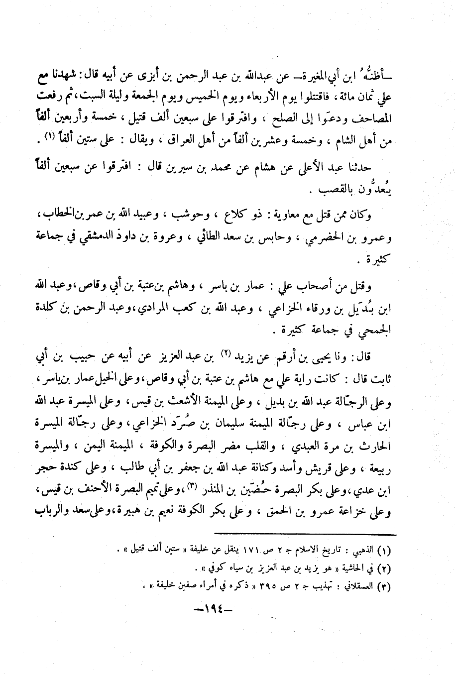 أَظُنهُ ابْن أَبِي الْمُغيرَة عَن عَبْد اللَّهِ بْن عَبْد الرَّحْمَن بْن أَبْزي عَن أَبِيه قَالَ شَهِدنَا مَعَ عَلِيّ ثَمَان مائَة فَاقْتَتلُوا يَوْم الْأَرْبَعَاء وَيَوْم الْخَمِيس وَيَوْم الْجُمُعَة وَلَيْلَة السبت ثمَّ رفعت الْمَصَاحِف ودعوا إِلَى الصُّلْح وافترقوا عَلَى سبعين ألف قَتِيل خَمْسَة وَأَرْبَعين ألفا من أهل الشَّام وَخَمْسَة وَعشْرين ألفا من أهل الْعرَاق وَيُقَال عَلَى سِتِّينَ ألفا حَدَّثَنَا عَبْد الْأَعْلَى عَن هِشَام عَن مُحَمَّد بْن سِيرِين قَالَ افْتَرَقُوا عَن سبعين ألفا يعدون بالقصب وَكَانَ مِمَّن قتل مَعَ مُعَاوِيَة ذُو كلاع وحوشب وَعبيد اللَّه بْن عُمَر بْن الْخطاب وَعَمْرو بْن الْحَضْرَمِيّ وحابس بْن سعد الطَّائِي وَعُرْوَة بْن دَاوُد الدِّمَشْقِي فِي جمَاعَة كَثِيرَة