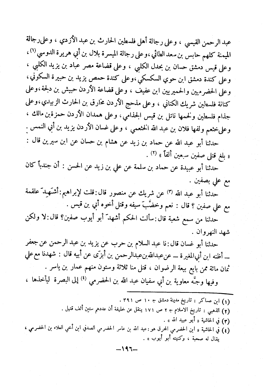حَدَّثَنَا أَبُو عُبَيْدَة عَنْ حَمَّادِ بْنِ سَلَمَةَ عَنْ عَلِيِّ بْنِ زَيْدٍ عَنِ الْحَسَنِ أَن جندبا كَانَ مَعَ عَلِيّ بصفين حَدَّثَنَا أَبُو عَبْد اللَّهِ عَن شريك عَن مَنْصُور قَالَ قلت لإِبْرَاهِيم أشهد عَلْقَمَة مَعَ عَلِيّ صفّين قَالَ نعم وخضب سَيْفه وَقتل أَخُوهُ أَبِي بْن قيس حَدَّثَنَا من سمع شُعْبَة قَالَ سَأَلت الحكم أشهد أَبُو أَيُّوب صفّين قَالَ لَا وَلَكِن شهد النهروان حَدَّثَنَا أَبُو غَسَّان قَالَ نَا عَبْد السَّلَام بْن حَرْب عَن يَزِيد بْن عَبْد الرَّحْمَن عَن جَعْفَر أَظُنهُ ابْن أَبِي الْمُغيرَة عَن عَبْد اللَّهِ بْن عَبْد الرَّحْمَن بْن أَبْزي عَن أَبِيه قَالَ شَهِدنَا مَعَ عَلِيّ ثَمَان مائَة مِمَّن بَايع بيعَة الرضْوَان قتل منا ثَلَاثَة وَسِتُّونَ مِنْهُم عمار بْن يَاسر وفيهَا وَجه مُعَاوِيَة بْن أَبِي سُفْيَان عَبْد اللَّهِ بْن الْحَضْرَمِيّ إِلَى الْبَصْرَة ليأخذها