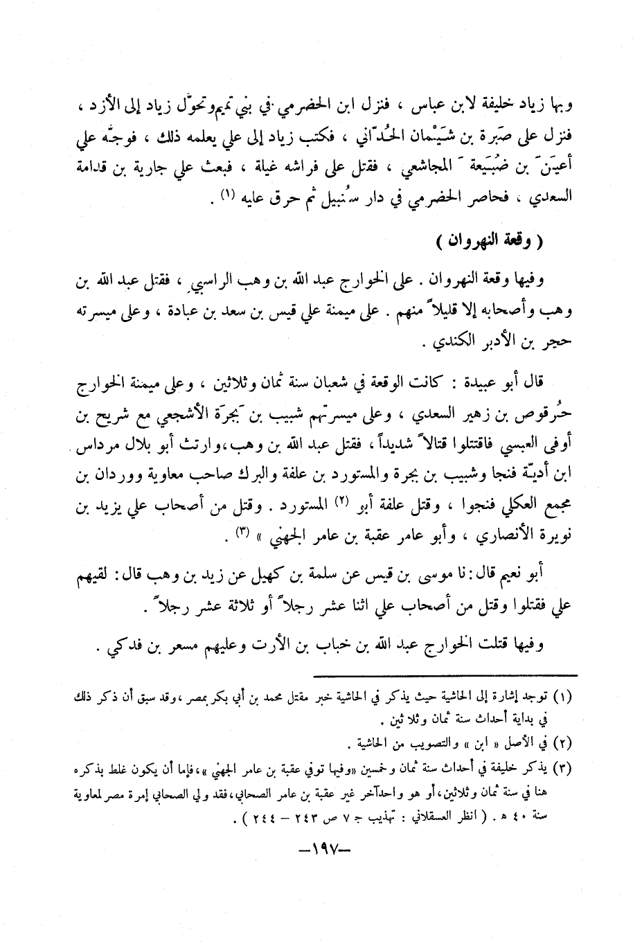 قَالَ أَبُو عُبَيْدَة كَانَت الْوَقْعَة فِي شعْبَان سنة ثَمَان وَثَلَاثِينَ وعَلى ميمنة الْخَوَارِج حرقوص بْن زُهَيْر السَّعْدِيّ وعَلى ميسرتهم شبيب بْن بجرة الْأَشْجَعِيّ مَعَ شُرَيْح بْن أوفى الْعَبْسِي فَاقْتَتلُوا قتالا شَدِيدا فَقتل عَبْد اللَّهِ بْن وهب وَارْتثَّ أَبُو بِلَال مرداس ابْن أدية فنجا وشبيب بْن بجرة والمستورد بْن علفة والبرك صَاحب مُعَاوِيَة ووردان بْن مجمع العكلي فنجوا وَقتل علفة أَبُو الْمُسْتَوْرد وَقتل من أَصْحَاب عَليّ يزِيد بن نُوَيْرَة الْأنْصَارِيّ وَأَبُو عَامر عقبَة بن عَامر الْجُهَنِيّ أَبُو نعيم قَالَ نَا مُوسَى بْن قيس عَن سَلمَة بْن كهيل عَن زيد بْن وهب قَالَ لَقِيَهُمْ عَلِيّ فَقتلُوا وَقتل من أَصْحَاب عَلِيّ اثْنَا عشر رجلا أَو ثَلَاثَة عشر رجلا وفيهَا قتلت الْخَوَارِج عَبْد اللَّهِ بْن خباب بْن الْأَرَت وَعَلَيْهِم مسعر بْن فدكي