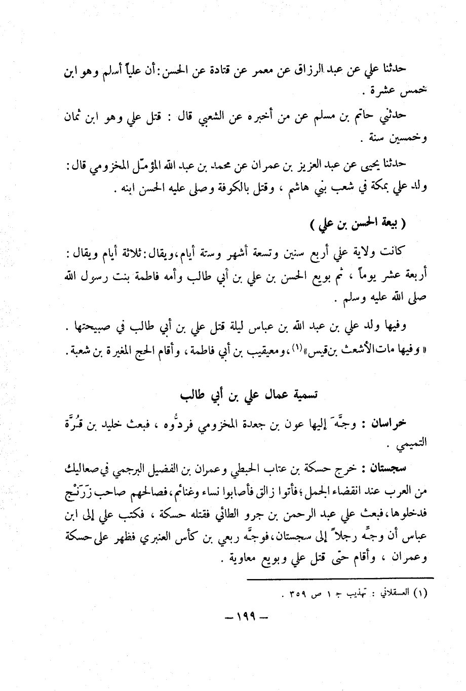 حَدَّثَنَا عَلِيّ عَن عَبْد الرَّزَّاق عَن معمر عَن قَتَادَة عَن الْحسن أَن عليا أسلم وَهُوَ ابْن خمس عشرَة حَدَّثَنِي حَاتِم بْن مُسلم عَن من أخبرهُ عَن الشّعبِيّ قَالَ قتل عَلِيّ وَهُوَ ابْن ثَمَان وَخمسين سنة حَدَّثَنَا يحيى عَن عَبْد الْعَزِيز بْن عمرَان عَن مُحَمَّد بْن عَبْد اللَّهِ المؤمل المَخْزُومِي قَالَ ولد عَلِيّ بِمَكَّة فِي شعب بَنِي هَاشم وَقتل بِالْكُوفَةِ وَصلى عَلَيْهِ الْحسن ابْنه