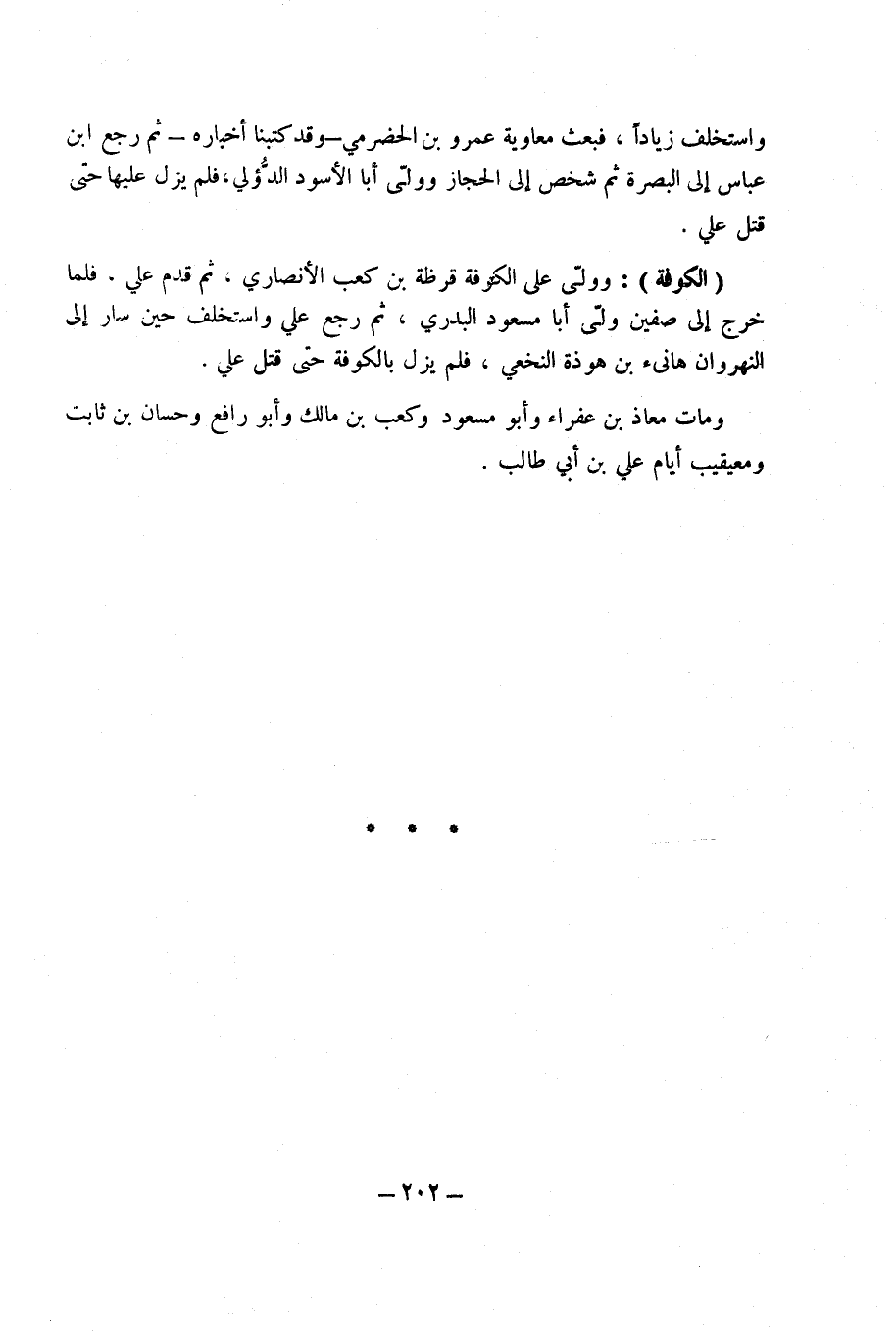 الْكُوفَة وَولى عَلَى الْكُوفَة قرظة بْن كَعْب الْأنْصَارِيّ ثمَّ قدم عَلِيّ فَلَمَّا خرج إِلَى صفّين ولى أَبَا مَسْعُود البدري ثمَّ رَجَعَ عَلِيّ واستخلف حِين سَار إِلَى النهروان هَانِئ بْن هَوْذَة النَّخعِيّ فَلم يزل بِالْكُوفَةِ حَتَّى قتل عَلِيّ وَمَات معَاذ بْن عفراء وَأَبُو مَسْعُود وَكَعب بْن مَالك وَأَبُو رَافع وَحسان بْن ثَابت ومعيقيب أَيَّام عَلِيّ بْن أبي طَالب