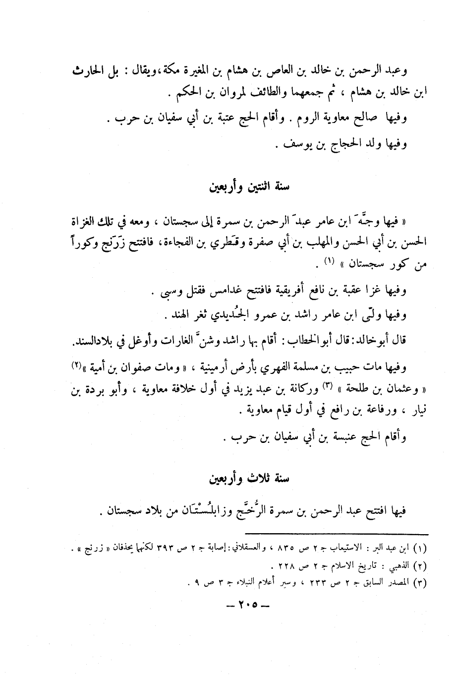 سنة اثْنَتَيْنِ وَأَرْبَعين فِيهَا وَجه ابْن عَامر عَبْد الرَّحْمَن بْن سَمُرَة إِلَى سجستان وَمَعَهُ فِي تِلْكَ الْغُزَاة الْحسن بْن أَبِي الْحسن والمهلب بْن أَبِي صفرَة وقطري بْن الْفُجَاءَة فَافْتتحَ زرنج وكورا من كور سجستان وفيهَا غزا عقبَة بْن نَافِع أفريقية فَافْتتحَ غدامس فَقتل وسبى وفيهَا ولى ابْن عَامر رَاشد بْن عَمْرو الجديدي ثغر الْهِنْد قَالَ أَبُو خَالِد قَالَ أَبُو الْخطاب أَقَامَ بهَا رَاشد وَشن الغارات وأوغل فِي بِلَاد السَّنَد وفيهَا مَاتَ حبيب بْن مسلمة الفِهري بِأَرْض أرمينية وَمَات صَفْوَان بن أُميَّة وَعُثْمَان بن طَلْحَة وركانة بْن عَبْد يَزِيد فِي أول خلَافَة مُعَاوِيَة وَأَبُو بردة بْن نيار وَرِفَاعَة بْن رَافع فِي أول قيام مُعَاوِيَة وَأقَام الْحَج عَنبسة بْن أَبِي سُفْيَان بن حَرْب