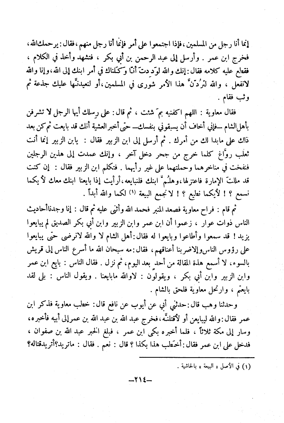 ثمَّ قَامَ فراح مُعَاوِيَة فَصَعدَ الْمِنْبَر فَحَمدَ اللَّه وَأثْنى عَلَيْهِ ثمَّ قَالَ إِنَّا وجدنَا أَحَادِيث النَّاس وَذَوَات عوار زَعَمُوا أَن ابْن عُمَر وَابْن الزبير وَابْن أَبِي بَكْر الصّديق لم يبايعوا يَزِيد قد سمعُوا وأطاعوا وَبَايَعُوا لَهُ فَقَالَ أهل الشَّام لَا وَالله لَا نرضى حَتَّى يبايعوا على رُؤُوس النَّاس وَإِلَّا ضربنا أعَناقهم فَقَالَ مَه سُبْحَانَ اللَّه مَا أسْرع النَّاس إِلَى قُرَيْش بالسوء لَا أسمع هَذِهِ الْمقَالة من أحد بعد الْيَوْم ثمَّ نزل فَقَالَ النَّاس بَايع ابْن عُمَر وَابْن الزبير وَابْن أَبِي بَكْر وَيَقُولُونَ لَا وَالله مَا بايعَنا وَيَقُول النَّاس بلَى لقد بايعتم وارتحل مُعَاوِيَة فلحق بِالشَّام وَحَدَّثَنَا وهب قَالَ حَدَّثَنِي أَبِي عَن أَيُّوب عَن نَافِع قَالَ خطب مُعَاوِيَة فَذكر ابْن عُمَر فَقَالَ وَالله ليبايعَن أَو لأقتلنه فَخرج عَبْد اللَّهِ بْنِ عَبْدِ اللَّهِ بْنِ عُمَر إِلَى أَبِيه فَأخْبرهُ وَسَار إِلَى مَكَّة ثَلَاثًا فَلَمَّا أخبرهُ بَكَى ابْن عُمَر فَبلغ الْخَبَر عَبْد اللَّهِ بْن صَفْوَان فَدخل عَلَى ابْن عُمَر فَقَالَ أَخطب هَذَا بِكَذَا قَالَ نعم فَقَالَ مَا تُرِيدُ أَتُرِيدُ قِتَاله